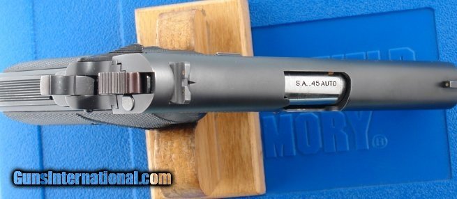 Description: SPRINGFIELD ARMORY CHAMPION 1911 4" BLUE .45ACP SEMI-AUTO PISTOL IN ORIGINAL BOX. Serial numbered "N-301XXX" and matching to blue platic box end label. Only slightly used with all the original factory blue with balance at edges(see photos). 4" "S.A .45 Auto" marked barrel with mint bore and rifling. Factory sights. Has original wood Springfield marked grip panels(in box) with aftermarket Pachmayr wrap-around w/ thumb rest grips on it now with Wilson Combat hex head grip screws(and wrench). Box includes manual. SOLD |