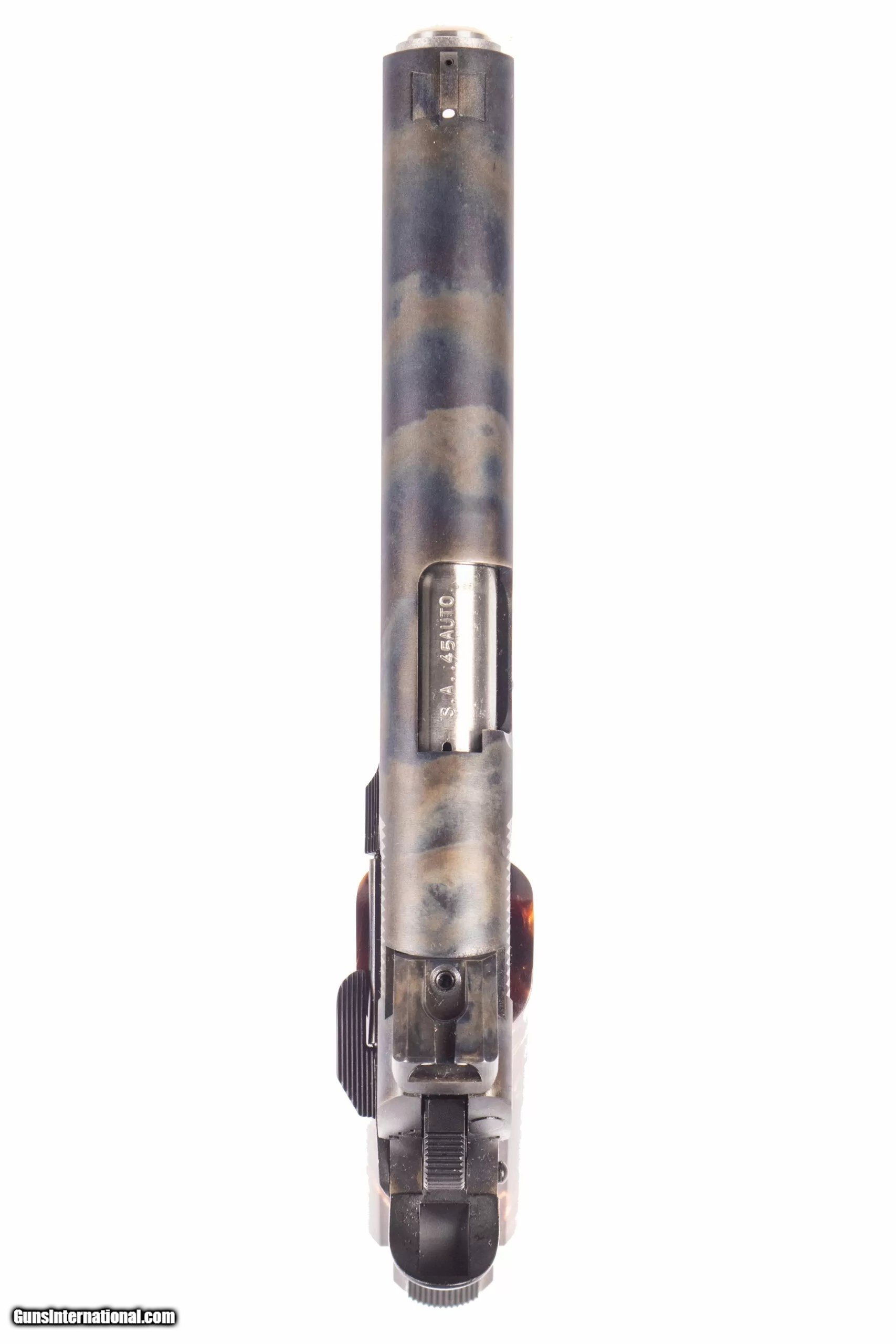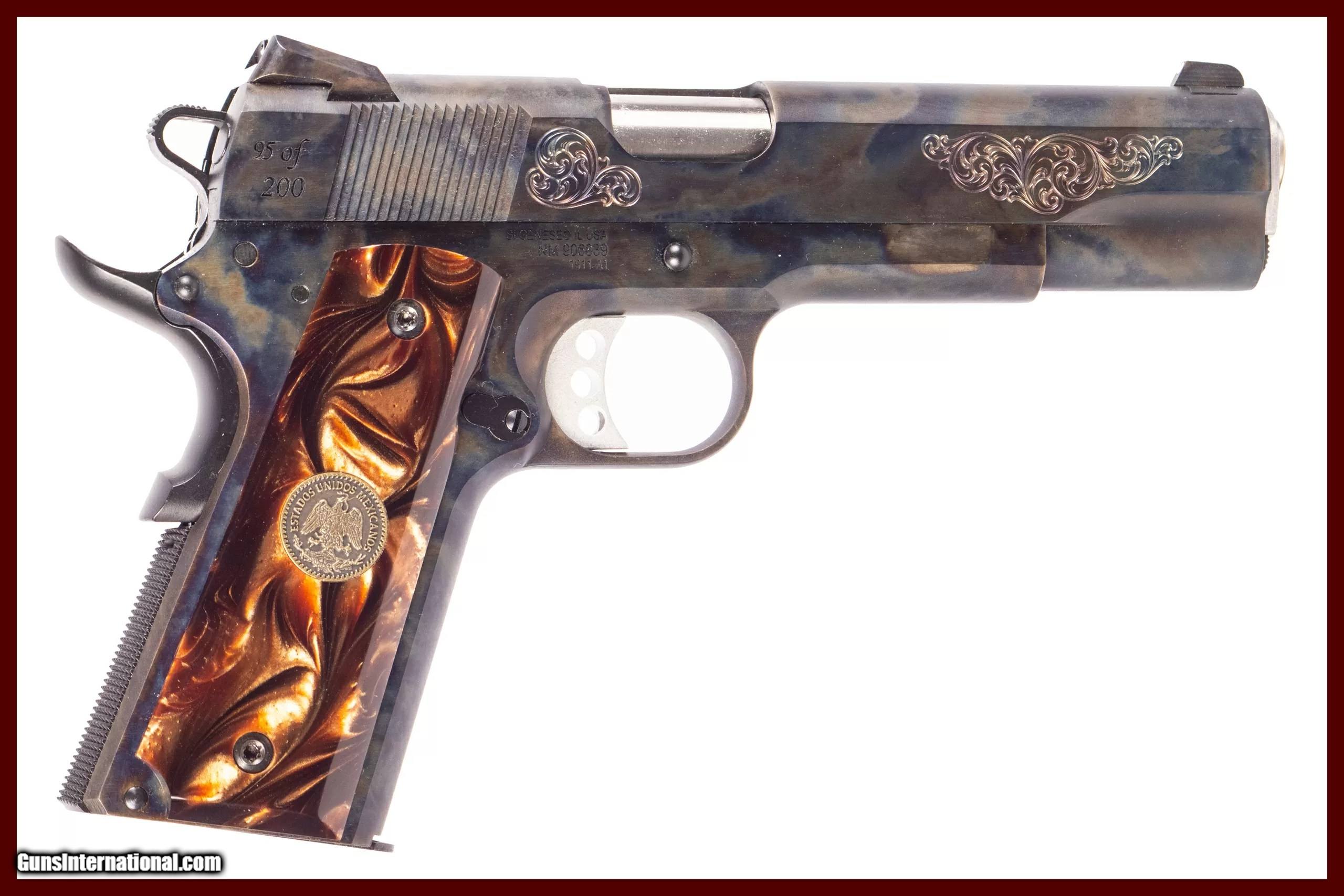 Description: Custom and Collectible Firearms Springfield Armory Presidential 1911-A1 chambered in 45ACP with a 5 inch barrel, mirror-shine near-pristine bore with immaculate rifling as this pistol has minimal rounds fired through. This pistol is 95 of 200 produced in collaboration with Custom and Collectible Firearms. Finished in beautiful case-color hardening complimented with floral paisley engravings and custom Mexican peso brown resin grips, this pistol also comes with a box. The NRA grading condition for this USED firearm is Excellent. We ship domestically in the United States. Additional shipping rates apply to Alaska and Hawaii. Dury's Lifetime Warranty: All firearms purchased from Dury’s Gun Shop, NEW or USED, are covered by a lifetime warranty. We will repair or replace, at our discretion, any firearm purchased from Dury’s Gun Shop, Inc. for as long as it is owned by the purchaser. This warranty is not transferable. WE BUY GUNS! NO COLLECTION TOO BIG OR SMALL FOR OUR GUNS INTERNATIONAL CUSTOMERS ALL OF OUR FIREARMS CAN BE PURCHASED DIRECTLY FROM OUR DURY'S GUNS SITE ! SOLD Manufacturer: Springfield Model: Presidential 1911-A1 Caliber Info: 45 ACP Barrels: 5inches |