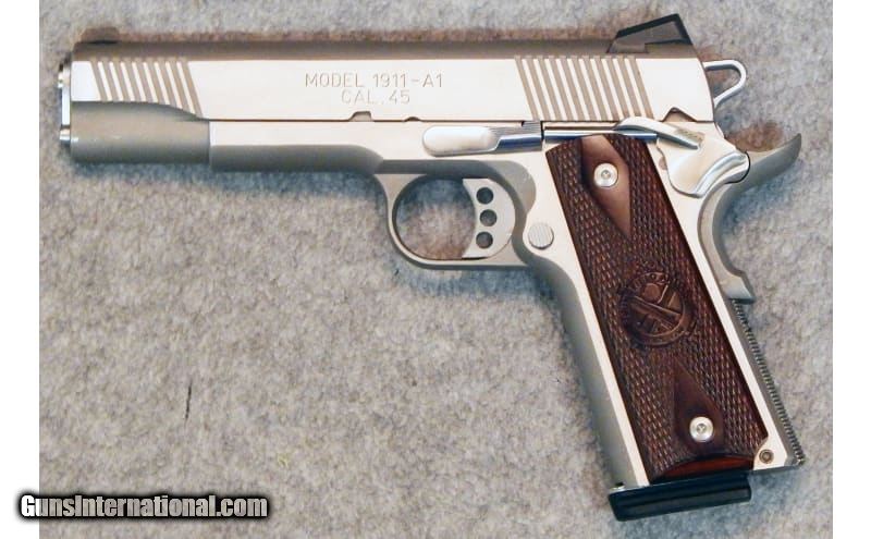 Description: Springfield Armory ~ M1911-A1 ~ Chambered in .45 Auto. Is a full size semiautomatic 1911 pattern handgun. Features a 5" stainless steel barrel paired with iron sights. Firearm has an ambidextrous thumb safety and an overall stainless steel finish complimented with walnut grips. Comes with factory hard case, holster, magazine pouch, documentation, and two 7 + 1 capacity magazines. .45 Auto SOLD Chambers: .45 Auto. Metal Condition: Very good condition. Bore Condition: Good condition. Triggers: 7.5 pounds. Weight: 2.5 pounds Sights: Iron sights. Item Location: Acworth, GA |
