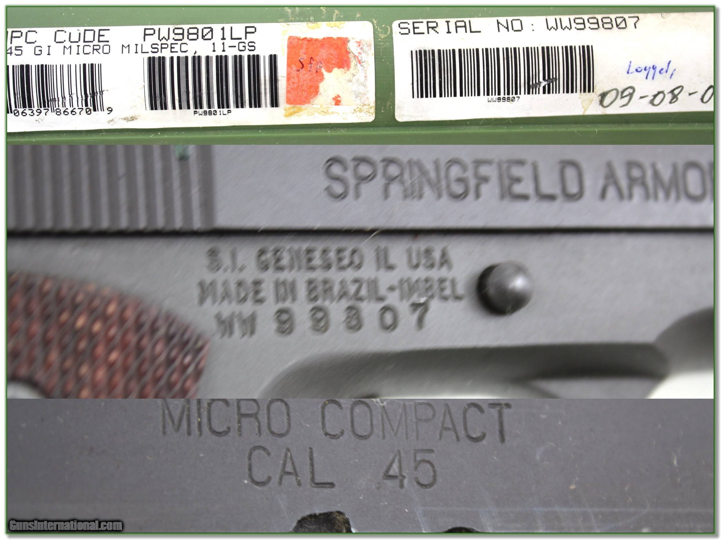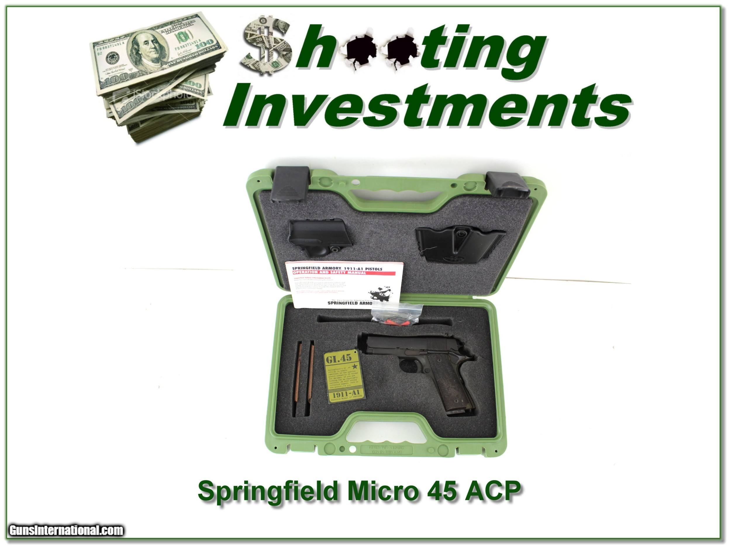 Description: This is a Springfield Micro Compact 1911 45 ACP. It is in excellent condition with light use and comes as seen in case with 2 sets of grips, papers and holster. I am selling this one on consignment and as such lay-a-way can’t be used. It does of course have the standard 3-day inspection. Shipping and insurance is $39. Please email me with any questions or larger pictures. (Consign your quality firearms with Shooting Investments for only 12%! Let me know if you have any you would like to sell!) 21-0568 Payment: Payment is by Money Order, Cashiers Check or Personal Check. I can now also accept Credit Cards (MasterCard, Visa, Discover & American Express) with a 3% convenience fee. Shipping: The shipping charge will be listed in each description. It is $39 for most firearms. Some heavy guns or those insured for over $2000 will be higher. Shipments to Alaska and Hawaii are higher because air shipment is required. Most firearms are shipped on Tuesday and Thursday and usually in 5 days of receipt of payment. We package all shipments carefully and insure them. Optics are shipped Priority Mail and most other non-firearm shipments are shipped First Class. Returns: Our return policy is simple. If for any reason you are not pleased with your purchase, you may return your item for a full refund of purchase price. Ammunition cannot be returned. It is important to us that you are happy. Guns cannot be fired or dissembled before returning them and they must be returned in the same condition as received. Notification of a return must occur with-in 3 days of receipt at your dealer. Shipping, convenience and dealer fees are not refundable and are the responsibility of the buyer. Lay-a-way: If needed, we offer a 60 day lay-a-way option on most firearms. It is 1/3 now, 1/3 in 30 days and 1/3 in 60 days. Lay-a-way firearm sales are final and if not completed the first payment cannot be returned. Consigning your firearms with Shooting Investments: We will help you get top dollar for your firearms. While most local guns shops charge 20% or more, our fee is only 12% with a minimum of $75. At your local gun shop it might take months to sell. Selling on-line provides instant access to thousands of interested buyers. You won’t find any other on-line dealer willing to sell your firearms for only 12% or listing every gun on 3 separate s. Selling through an House typically costs the seller 15% and the buyer an addition 15% (so 30%) and you have to wait several months to sell and longer to receive funds. If properly priced, we will sell your firearms in a few weeks. Send us an email or give us a call and we’ll explain how easy it is for you to get top dollar. Trading: Trading for use is really just buying your gun to re-sell. If you have a gun you want to trade, please email a picture and we will let you know what we can give or it. You will always get more if we sell it for you on consignment. Help for California Buyers: We are happy to ship to California. It is the buyer’s responsibility to make sure any item you buy is legal in your state. We are also happy to help with your purchase of a firearm from someone other than us. If you see a gun you would like to buy but the seller can’t or won’t ship to California they can ship to use and we’ll then ship it to your California dealer. The cost for this service is only $30 + shipping. Let us know if we can help! SOLD |