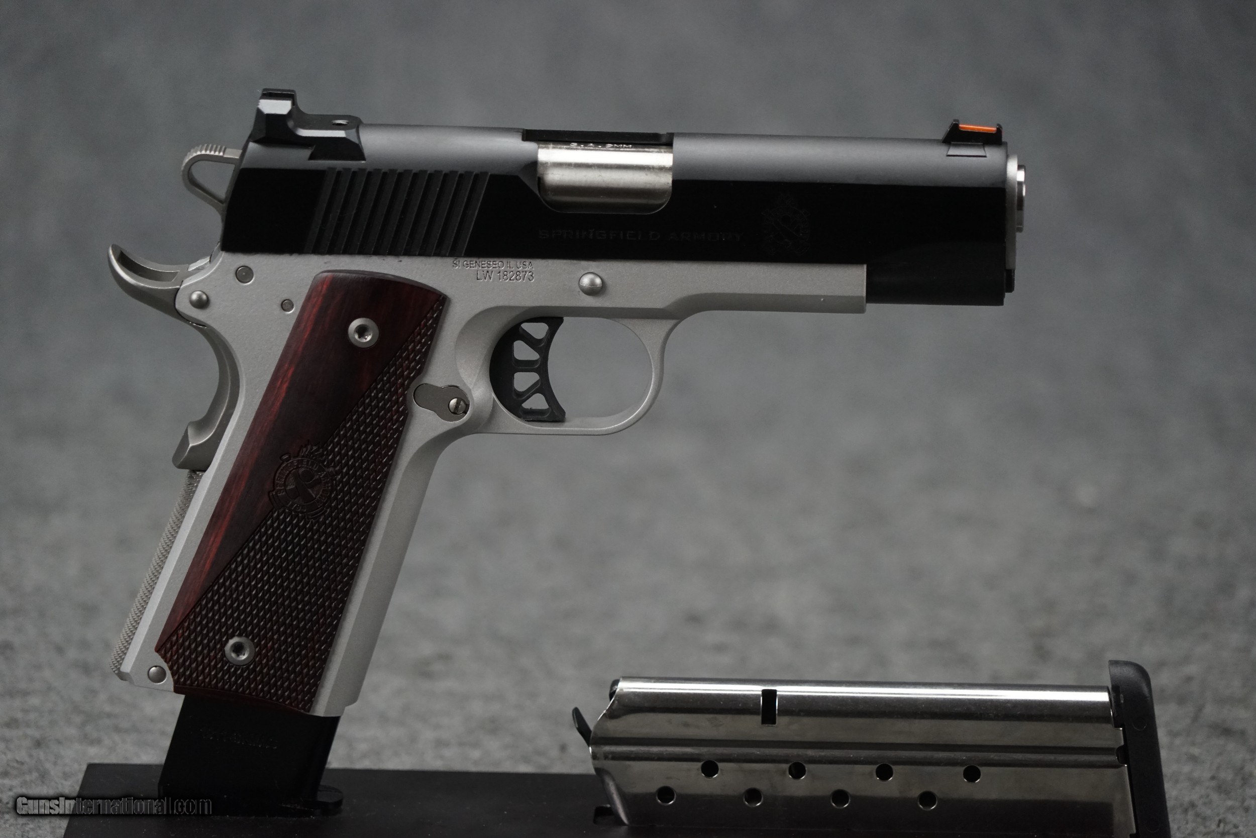 Description: Featuring an unyielding commitment to strength, reliability and quality, ?the Ronin 4.25" combines rugged durability with light weight and ease of carry. The 9mm pistol features a forged alloy frame for an overall light weight of around 30 ounces. The short 4.25" barrel matches up with a traditional barrel bushing system, and a forged hot salt blued slide and stainless steel hammer-forged barrel ensure a lifetime of service. CALIBER 9mm COLOR Blued / Satin Aluminum BARREL 4.25" Forged Stainless Steel, Match Grade, Fully Supported Ramp, 1:16 SLIDE Forged Carbon Steel, Blued FRAME Forged Aluminum Alloy, Satin Aluminum Cerakote® SIGHTS Fiber Optic Front, Tactical Rack White Dot Rear RECOIL SYSTEM Commander Length GI Style GRIPS Crossed Cannon Wood Laminate MAGAZINES (1) 9-Round WEIGHT 31 oz LENGTH 7.9" HEIGHT 5.5" SOLD Handgun Caliber: 9x19mm Parabellum (9mm Luger, 9x19mm NATO) Manufacturer: Springfield Armory Model: 1911 Ronin Barrel Length: 4.25" Barrel Condition: BRAND NEW |