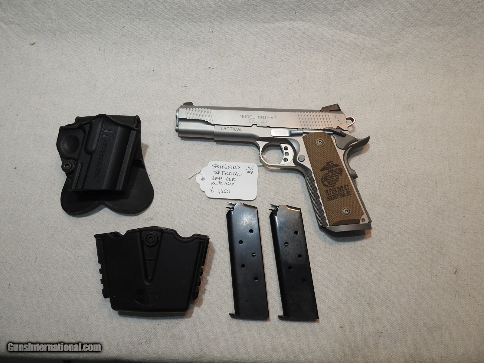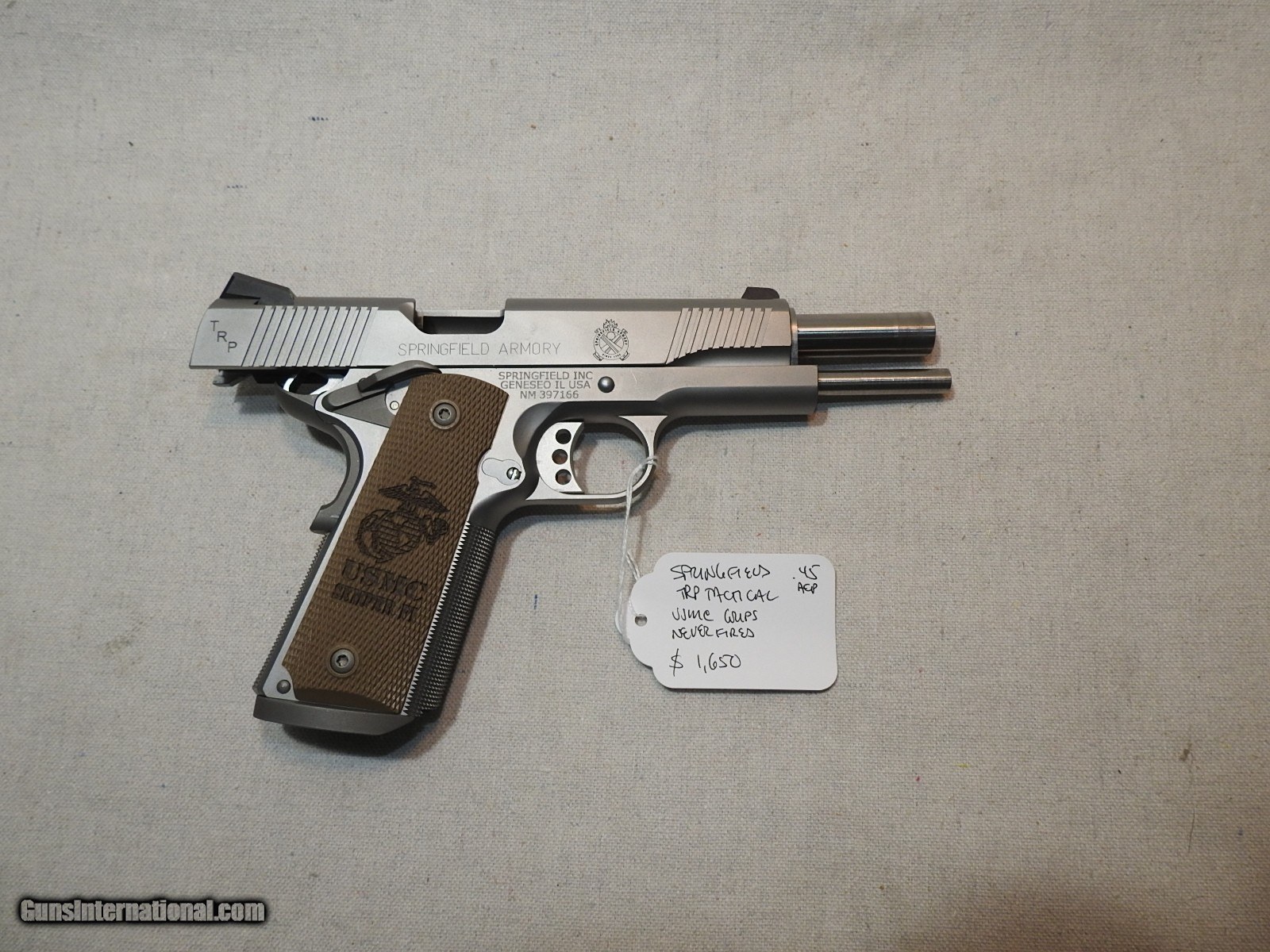 Description: Springfield Armory TRP Tactical in .45 ACP USMC Hogue Grips. NM barrel. Two (2) magazines Holster and mag holster incxluded. Never fired, in original case. Buyer pays shipping. Sorry, no sales to CA, or IL. SOLD Handgun Caliber: .45 ACP (.45 Auto) |