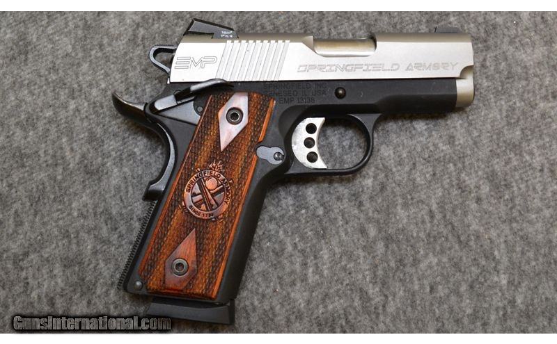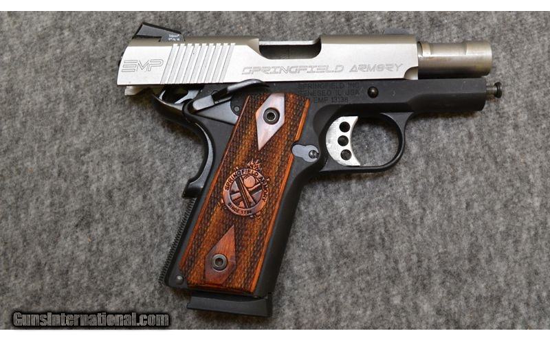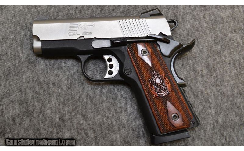 Description: Springfield EMP in 9 mm. This pistol does have carry markings. It is a very smooth action. It has a 3" bull barrel with a near full length grip. It comes with 2 magazines 9mm Luger SOLD Barrels: 3 inches Weight: 1 Lb 8 Oz. Item Location: Charleston, WV |