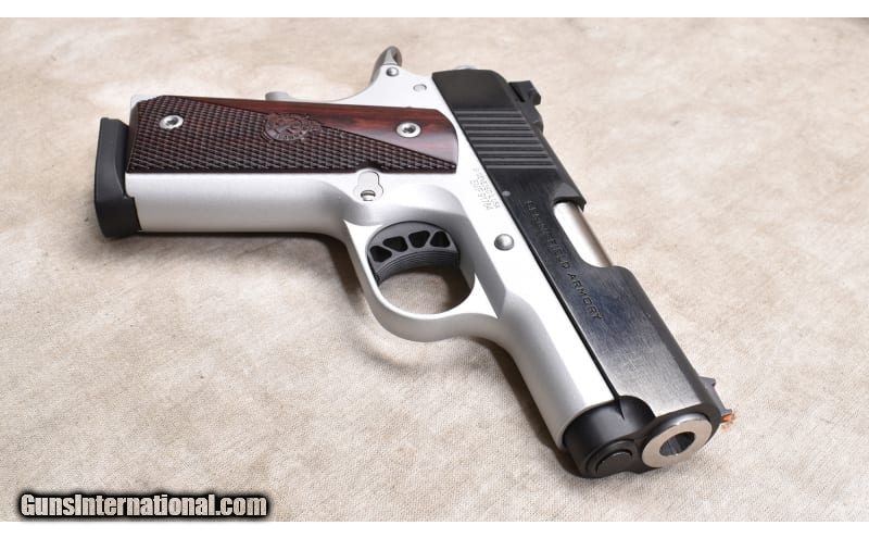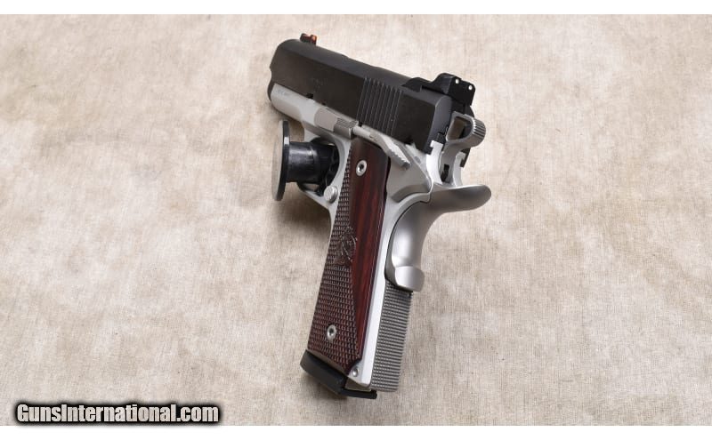 Description: Pocketable 1911 featuring 3-inch barrel, alloy frame, blue steel slide, easy to see sights, and dual safeties. It doesn't appear to have been fired much if at all, and could pass for new. 9mm Luger SOLD Chambers: 9 + 1 capacity Metal Condition: Excellent. Wood Condition: Excellent. Bore Condition: Shiny and bright with crisp rifling. Barrels: 3-inch Triggers: Factory single action only. Butt Pad: Checkered hardwood. Weight: 26 oz. Sights: Fiberoptic bead and notch. Item Location: Rogers |