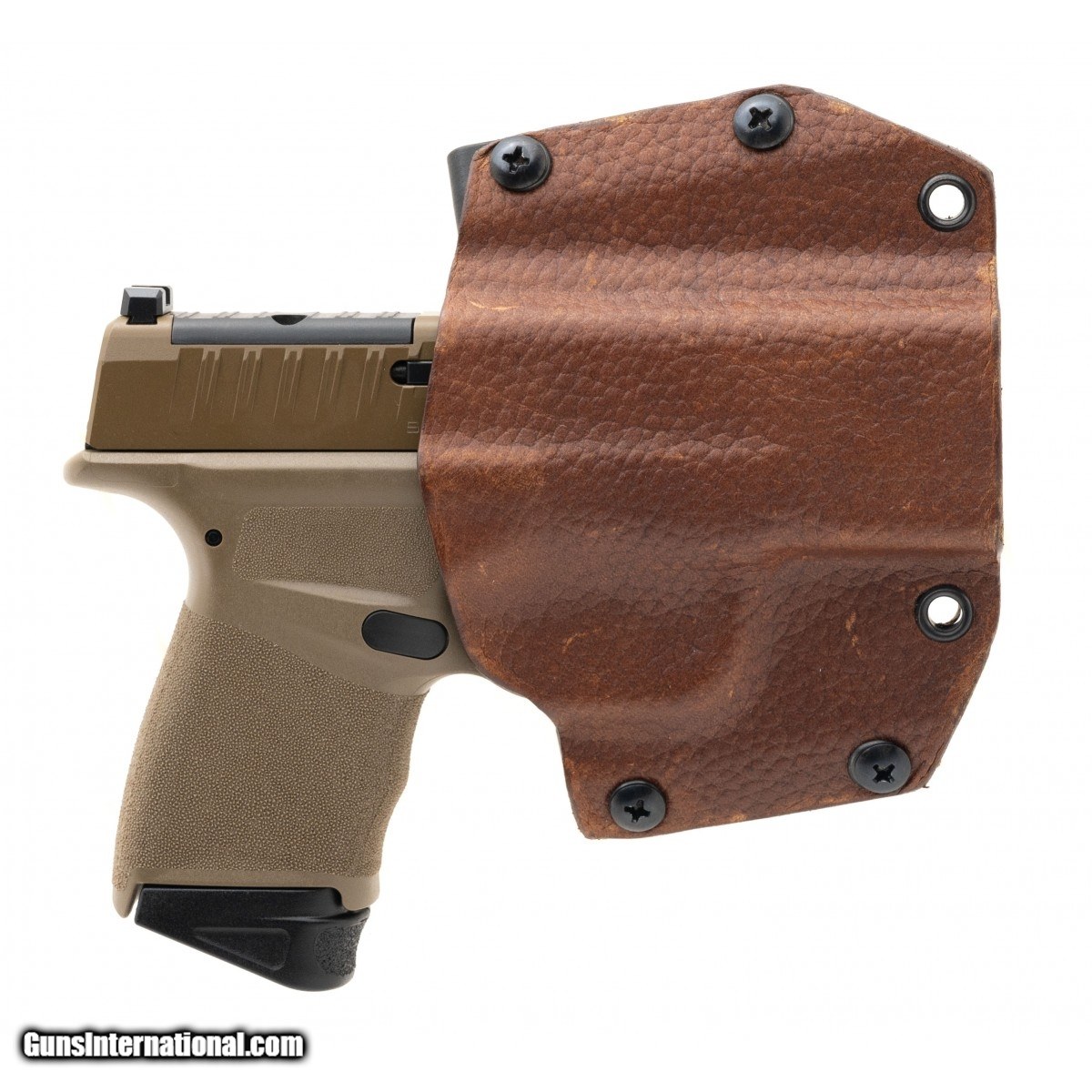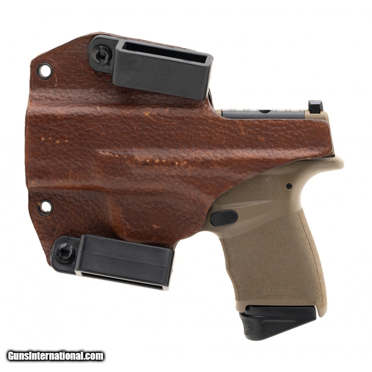 SN: BB359703. Modern production. 9x19 parabellum with a 3.1"", bore is excellent. Micro compact handgun with FDE finish, polymer frame and optic ready slide. Overall excellent condition. Comes with box, range bag, 2 13rd magazines, 2 15rd magazines and leather holster.