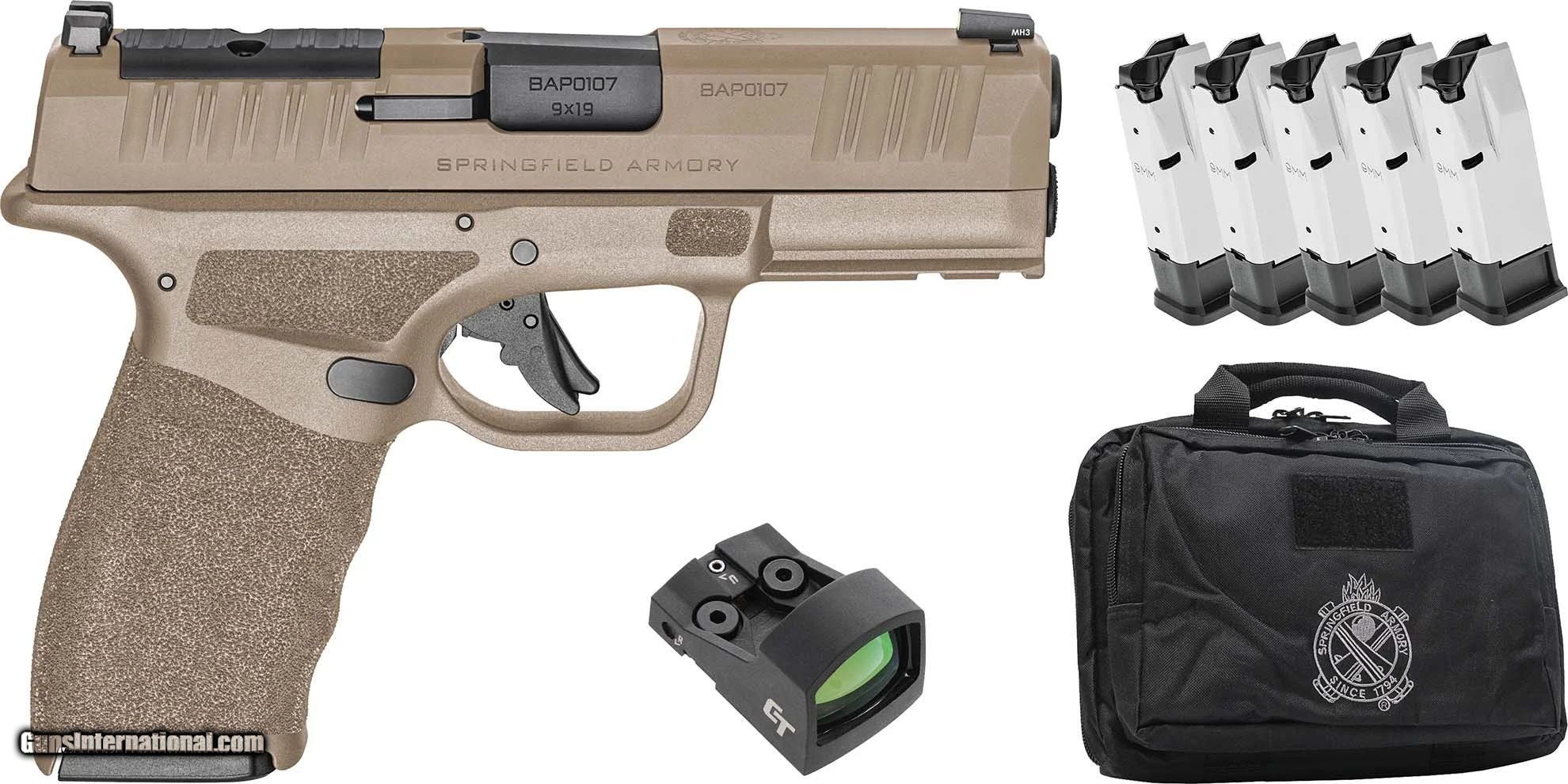 Description: Guns Listing ID: 505647 The Springfield Hellcat Pro is a compact, striker-fired 9mm pistol featuring a 3.7\" hammer-forged barrel, 10-round capacity, and a rugged Flat Dark Earth Cerakote finish. This optics-ready model includes a Crimson Trace CT-1500 red dot sight, along with five magazines and a dual range bag, making it a fully equipped option for carry, training, or personal defense. The Hellcat Pro is built for concealed carry with duty-grade performance. Its 3.7\" hammer-forged steel barrel is Melonite finished for durability and features a 1:10 twist rate for optimal accuracy. The billet-machined, optics-ready slide includes a tactical rack U-notch rear sight and a tritium/luminescent front sight, offering excellent visibility in all lighting conditions. The Flat Dark Earth polymer frame features Springfield’s adaptive grip texture for enhanced control and comfort. A pre-installed Crimson Trace CT-1500 red dot optic delivers rapid target acquisition. The pistol includes five 10-round magazines and a dual range bag, offering exceptional value right out of the box. SOLD Manufacturer: SPRINGFIELD ARMORY Model: HELLCAT PRO OSP Caliber Info: 9MM LUGER (9x19 PARA) Condition: new Barrels: 3.7" BARREL Action: SEMI AUTOMATIC Finish: flat dark earth Weight: 1.31 LBS. |