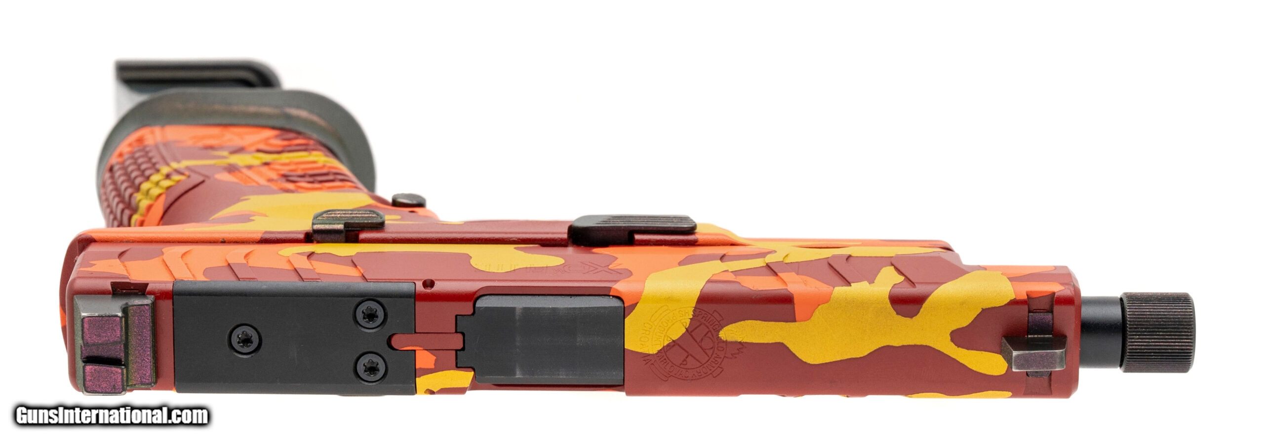 Description: "SN: BY305840. Modern production, 9mm with a 4.5"" threaded barrel. Bore is bright with strong rifling. Full size striker fired pistol with an optic cut, suppressor height sights, flared magwell, and custom cerakoted camo finish & sparkle coated accents. Metal shows light handling wear. Overall condition is very good. SOLD |