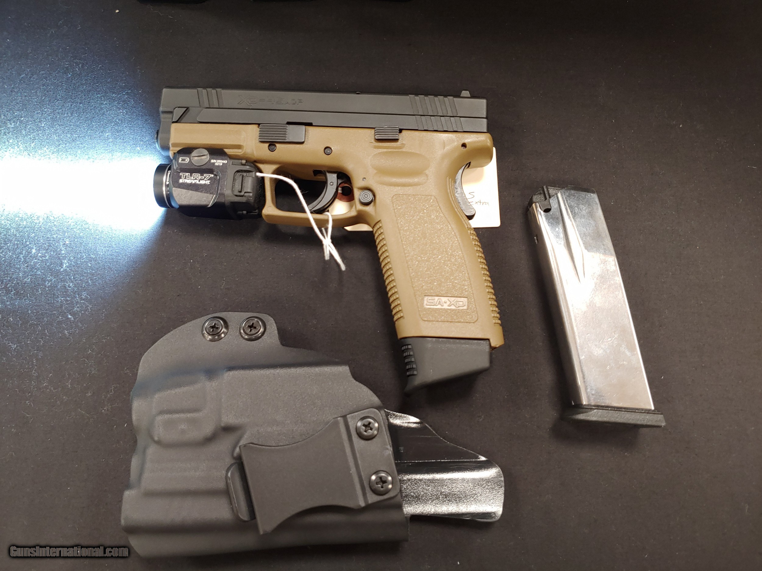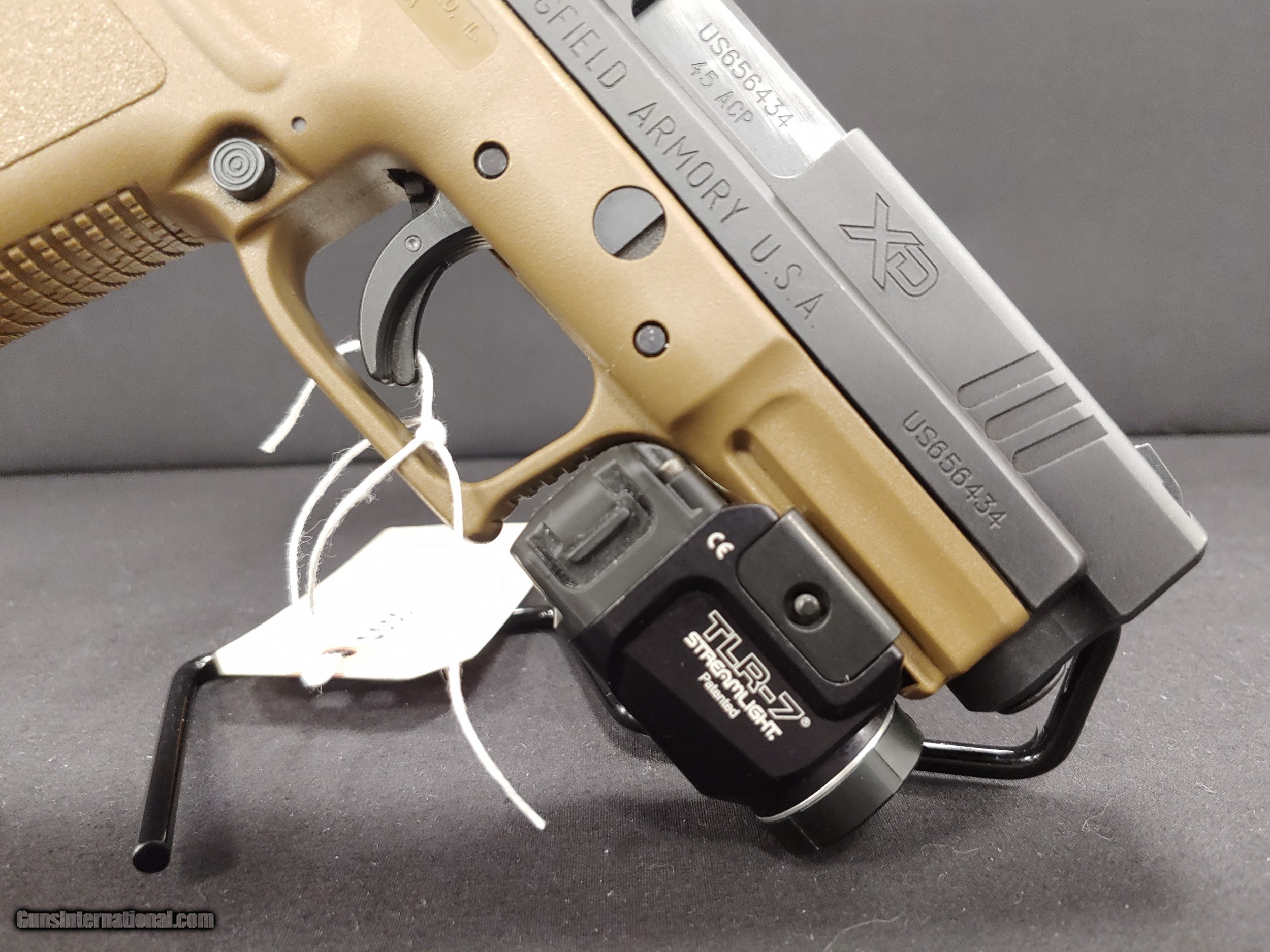Description: The XD® 4″ Full Size pistol from Springfield Armory® sets the standard for polymer pistols. The XD® 4″ Full Size has everything you want and need in a pistol – superior ergonomics, reliable performance, and features that make it easy and intuitive to use. The XD® 4″ Full Size has a four-inch barrel and a full-sized frame. This means you’ll get the handling and accuracy you’d expect from a standard sized pistol. All Springfield Armory® XD®’s have several features that make the XD® easy to use and safe to handle. The striker status indicator and loaded chamber indicator let you know without a doubt, by touch and by feel, whether or not the pistol is loaded and cocked. The grip safety, Ultra Safety Assurance (USA) Action Trigger System™, and the firing pin block safety combine to prevent accidental discharges. Whether you’re looking for a pistol based on ergonomics, reliability or features, you’re in the right place. This gun is in great condition & comes with a holster, 2 magazines & a Streamlight TLR-7 Flashlight. 3 more magazines available for an additional $25.