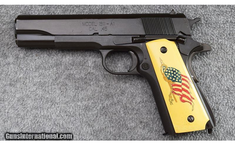 Description: This Springfield Armory model 1911 A-1 is in excellent overall condition showing only light use. Some carry wear on frame with a few light marks. Complete with non-original Springfield Armory blue plastic case! .45 Auto SOLD Metal Condition: Very Good Bore Condition: Excellent Barrels: 5 Triggers: Factory Butt Pad: Ivory Colored Plastic Grips with American Flag Weight: 24 oz. Sights: Blade Front with White Paint Item Location: Wheeling |