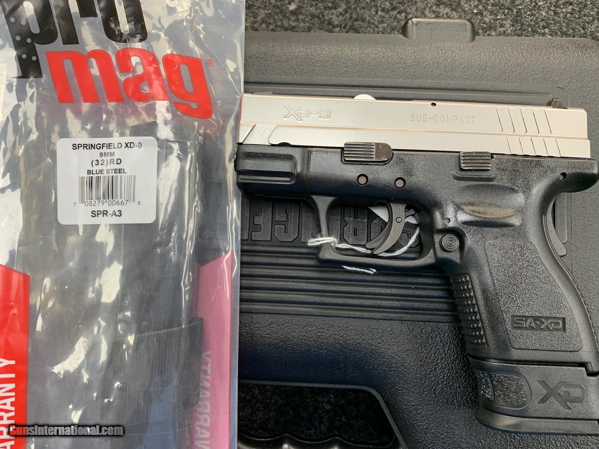 Description: Guns Listing ID: 315719 INCLUDES ONE 16 ROUND MAGAZINE AND ONE 32 ROUND EXTENDED MAGAZINE. Chambered in 9mm, this Springfield XD-9 Sub-Compact delivers rock-solid craftsmanship combined with a budget-friendly price for an unbeatable package. With outstanding ergonomics, unwavering reliability, and an impressive magazine capacity, this pistol makes an excellent concealed carry weapon. This XD-9 is in very good condition and comes with two 10-round magazines and an IWB holster. SOLD Manufacturer: SPRINGFIELD ARMORY Model: XD-9 SUB-COMPACT 32 RND MAGAZINE Caliber Info: 9 MM Condition: Used - Non-Certified Barrels: 3 BARREL Finish: SILVER AND BLACK |