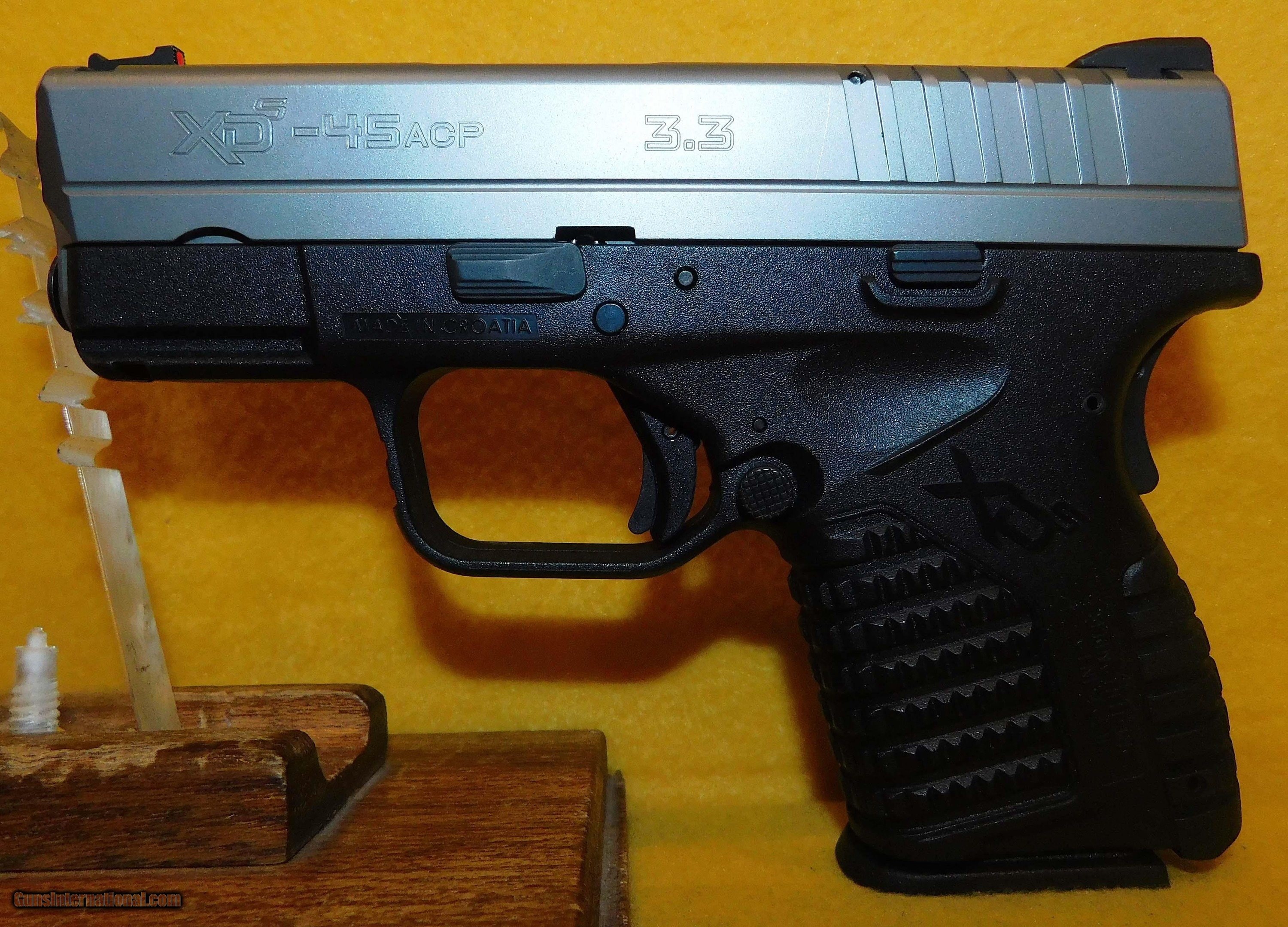 Description: SPRINGFIELD ARMORY XDS IN .45 ACP CAL., WITH 3 .25" BARREL. COLOR TWO TONE. CONDITION 98% LIKE NEW UNFIRED. SERIAL NUMBER XS535575. SPRINGFIELD ARMORY MODEL XDS IN .45 ACP CALIBER, COMES WITH HOLSTER, SPARE MAG. POUCH, THREE SINGLE STACK FACTORY MAGAZINES, HARD CASE WITH PAPERS, 98% LIKE NEW UNFIRED OVERALL CONDITION, OUR STOCK # D3129 SOLD |