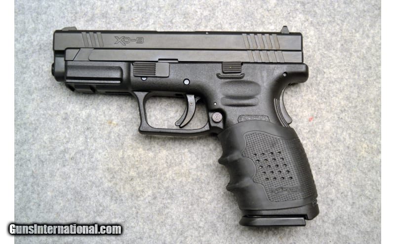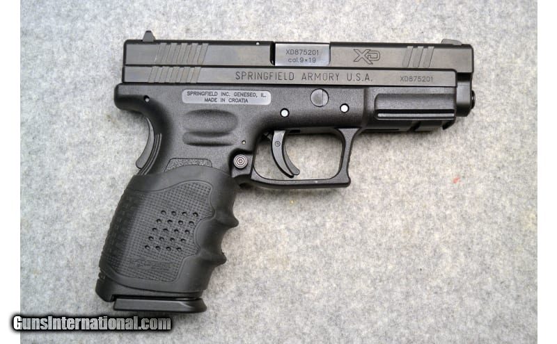 Description: This Springfield Armory Model XD-9 is a right hand semi-auto pistol in 9mm Cal. It has a 4 inch barrel with a front and rear serrated slide. A blade front sight and notch rear sight with white sight dots. The grip is a textured black polymer. It has a lower accessory rail and loaded chamber indicator. Includes Boomstick rubber grips and two magazines. 9mm Luger SOLD Barrels: 4 Weight: 2 lb Item Location: christiana |