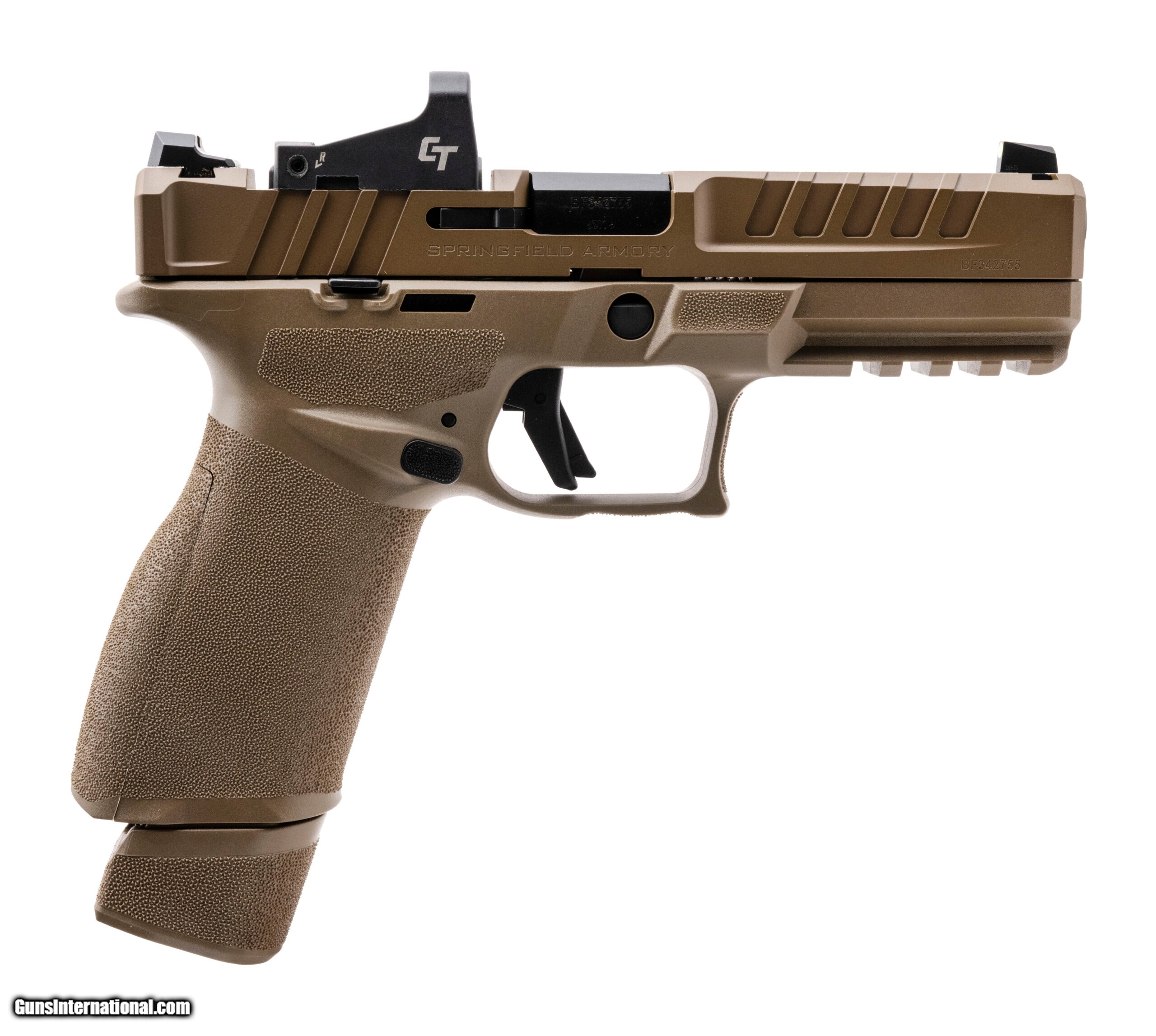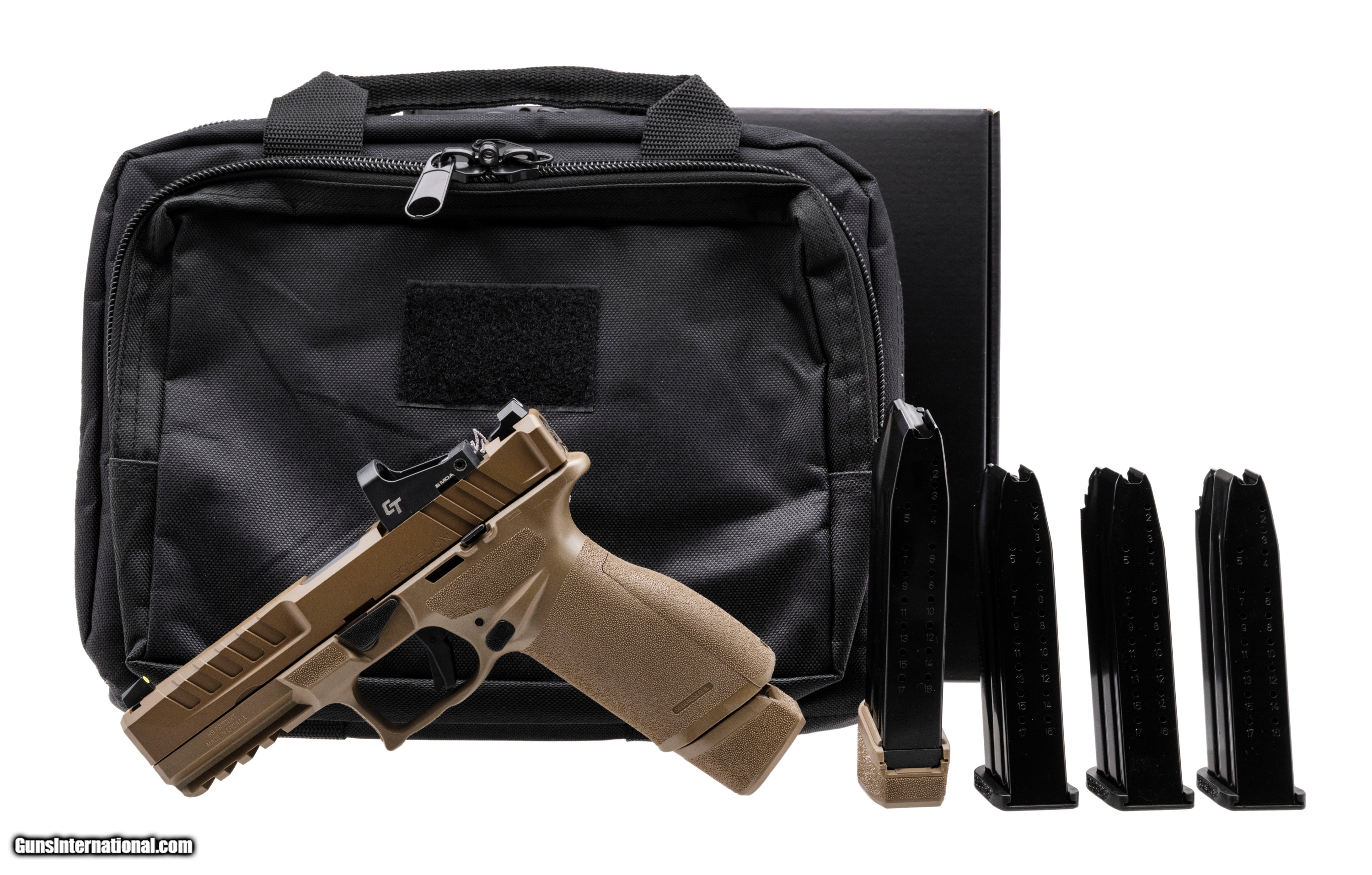 Description: "Semi-Automatic Striker Fired Pistol with a 4.25"" Barrel. Full Size, FDE Melonite Finish, Polymer Frame, Optic Ready, Tritium Front Sight, and Ambidextrous Slide Release. Includes 3-17rd & 2-20rd Magazines, Crimson Trace CT-1500 Red Dot Optic, and an SA Carry Bag & Range Bag. NEW. UPC: 706397990411 (STOCK PHOTO) SOLD |