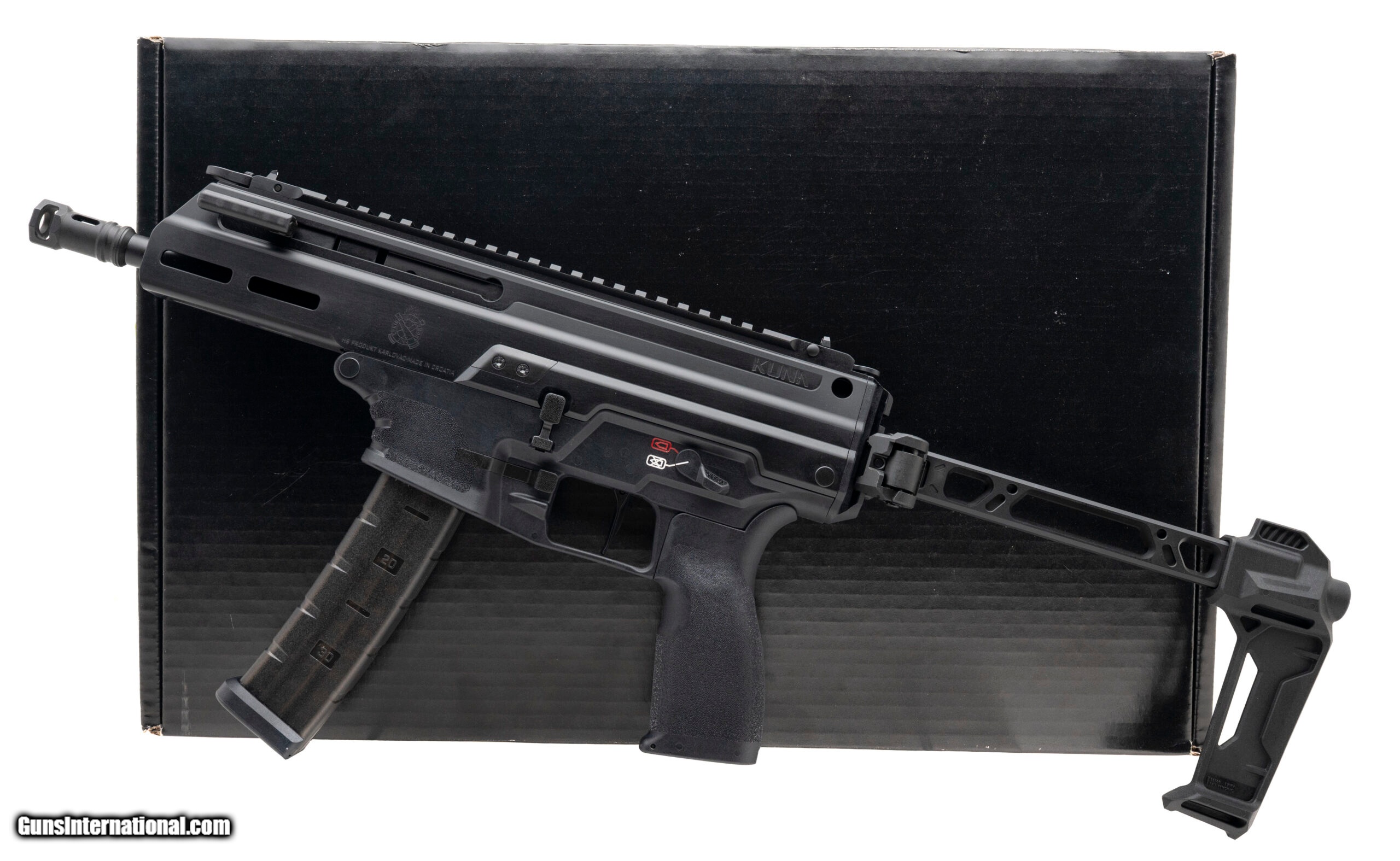 Description: "Semi-Automatic Tactical Pistol with a 6.125"" Threaded Barrel. Matte Finish, Polymer Grip, Flat Face Trigger, Side Folding Stabilizer, Flip up Sights and Optic Rail. Includes 2-30rd Magazines. NEW. UPC: 706397988951 (STOCK PHOTO) SOLD |