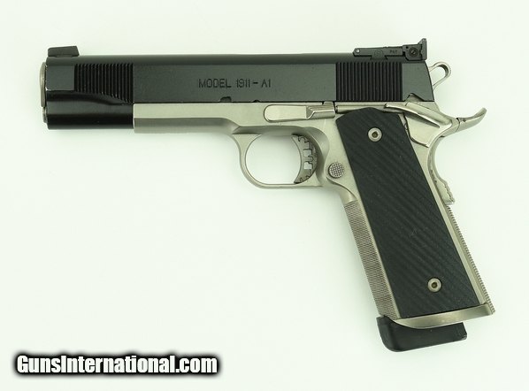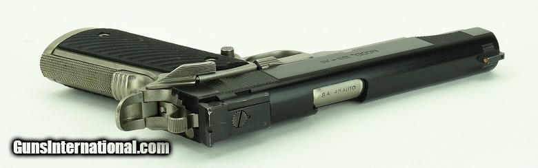 Springfield 1911-A1 .45ACP caliber pistol. Custom target gun with Bo-Mar sights, checkered grip strap, upgrade fire controls and trigger job, and Magwell. The frame is marked “Phil’s Custom”. A good gun in very good condition.
