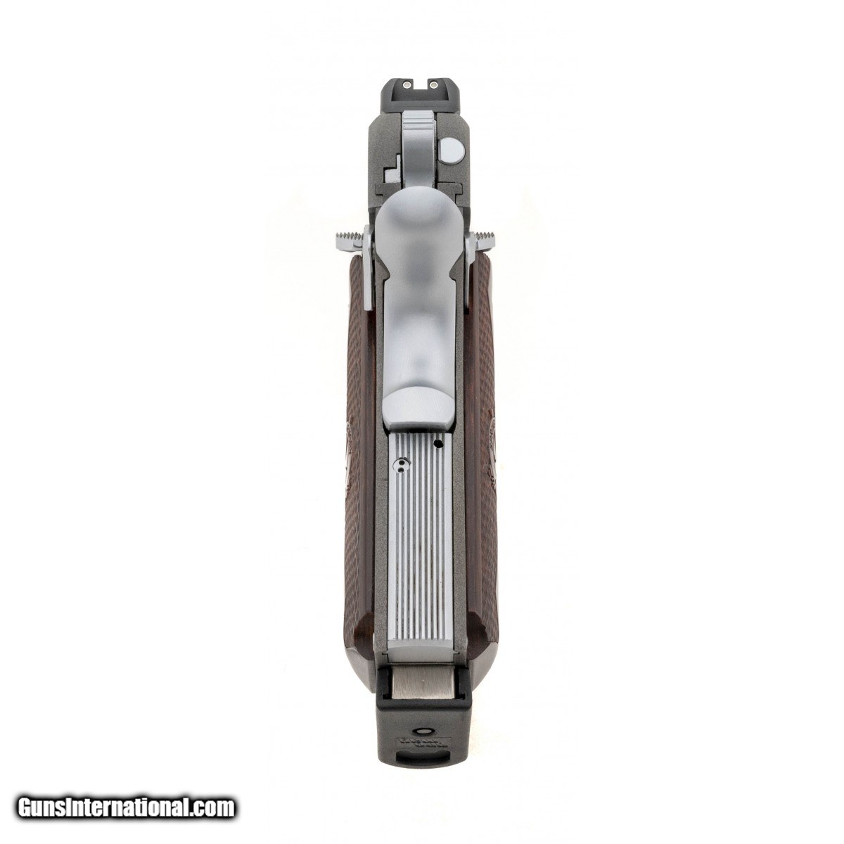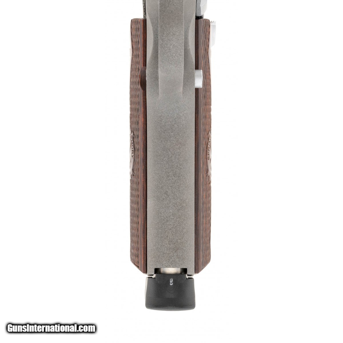 Description: " SN:N569163. Single action 4"" 1911 with rose-colored checkered grips and a S.S. finish. In excellent condition. Comes in box with 2 spare mags and Kydex pistol & magazine OWB holsters. SOLD |