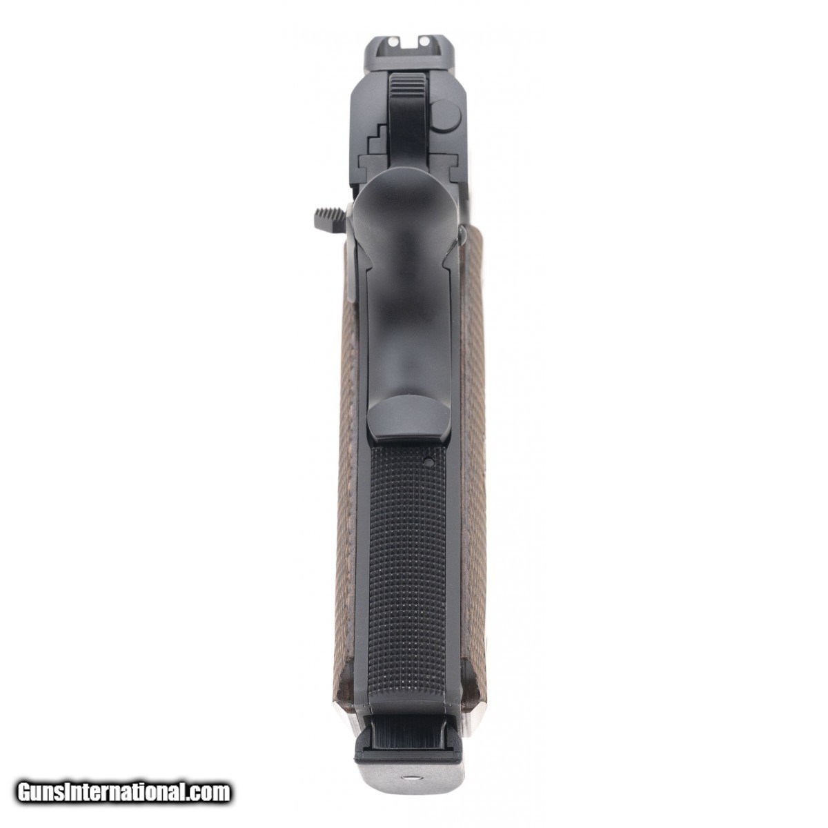 Description: " SN:NM736742. Single action 1911 with a set of dark wooden checkered grip panels. In excellent condition. Comes in a range pouch. SOLD |