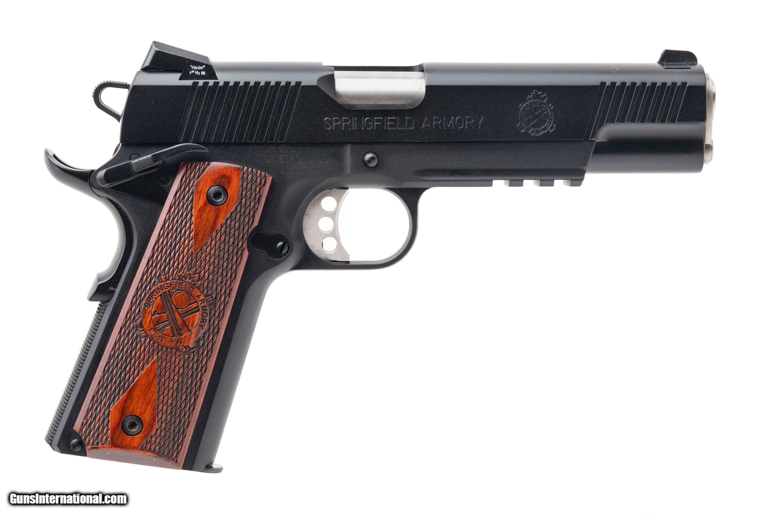 Description: "SN: LW115758. Modern production, .45 With a 5"" barrel. Bore is bright with strong rifling. Alloy frame single action 1911 style pistol night sights and tactical rail. Finish and checkered wood grips are in excellent condition. Comes with case and three extra magazines. Overall condition is excellent. SOLD |