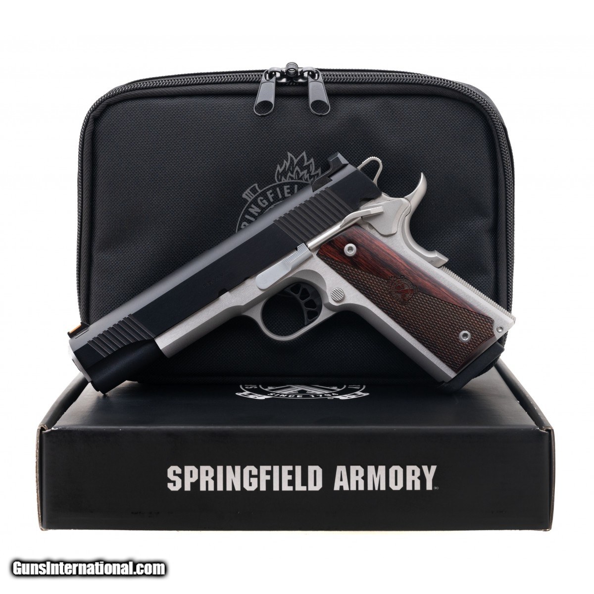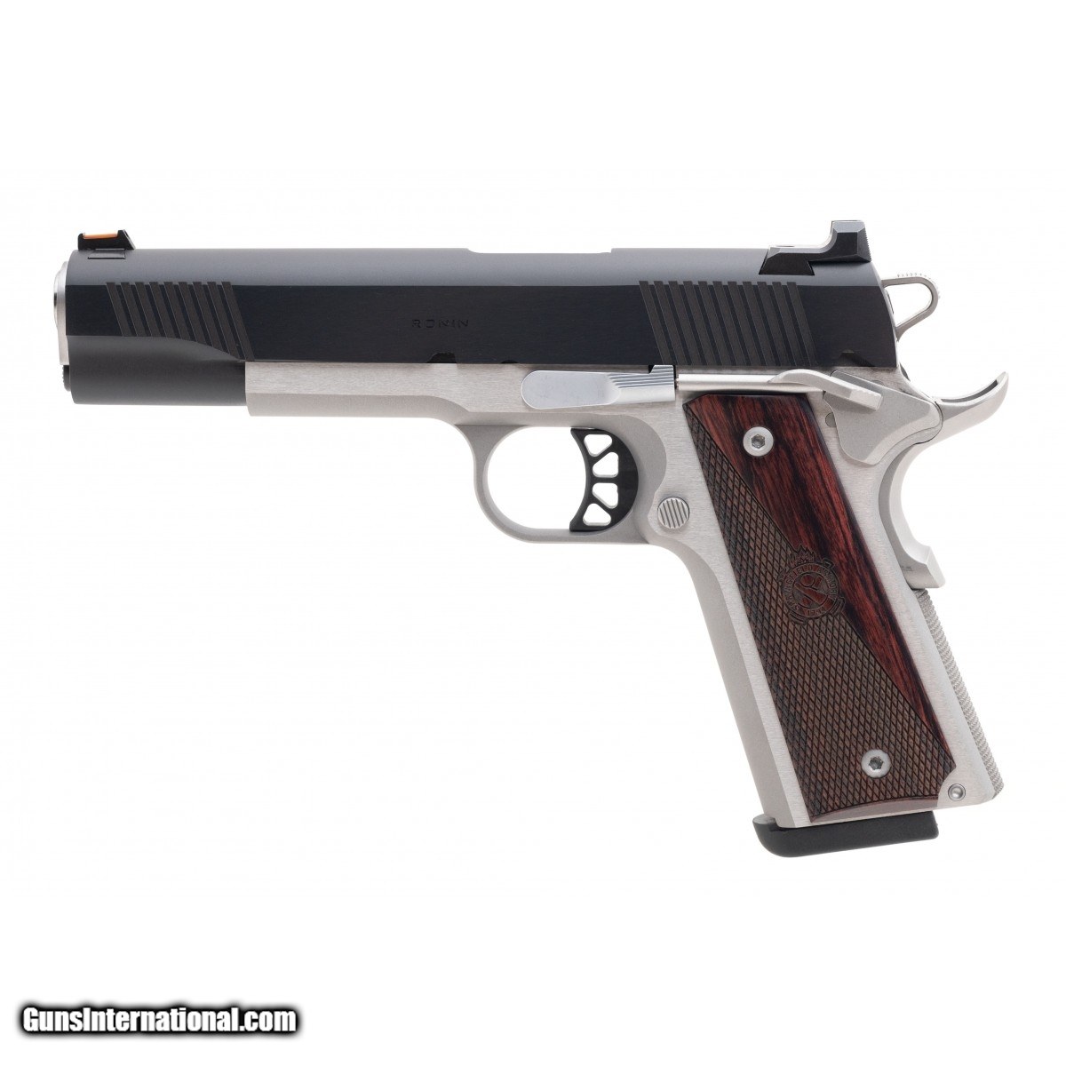 Two-tone 1911 with 5"" barrel, blued slide, wood grips, stainless frame, fiber optic front sight, manual thumb safety and extended beavertail. NEW. UPC: 706397930134