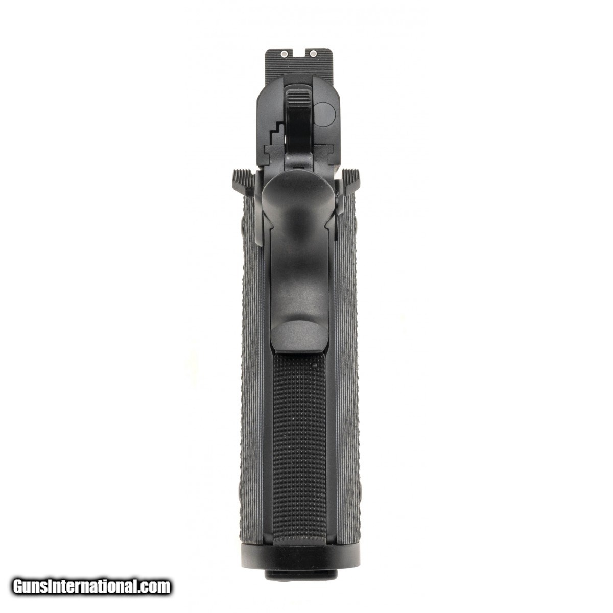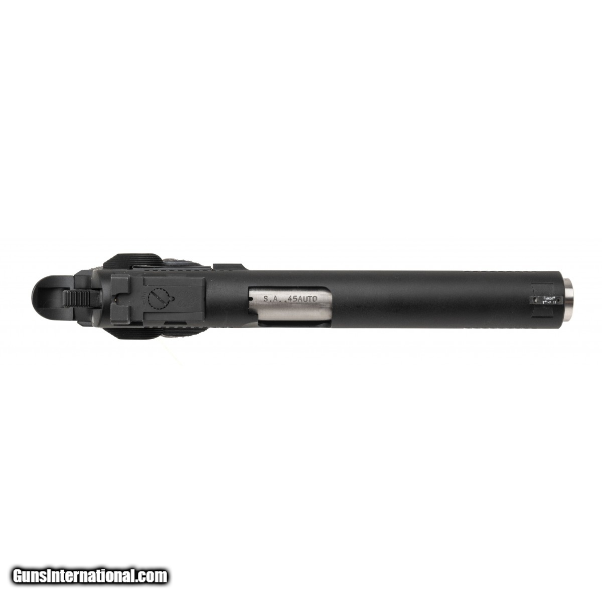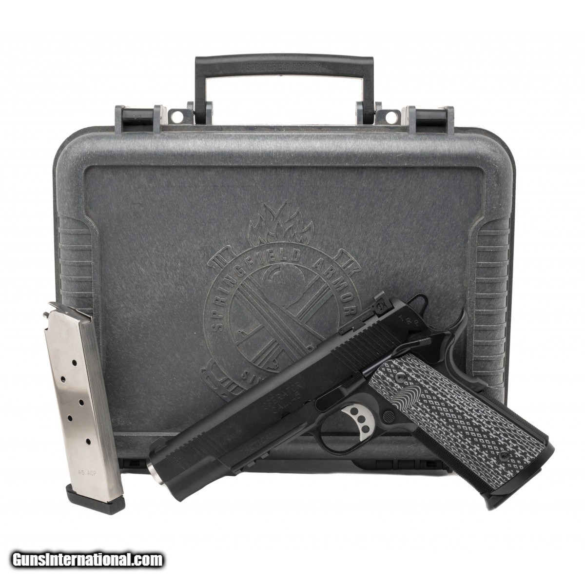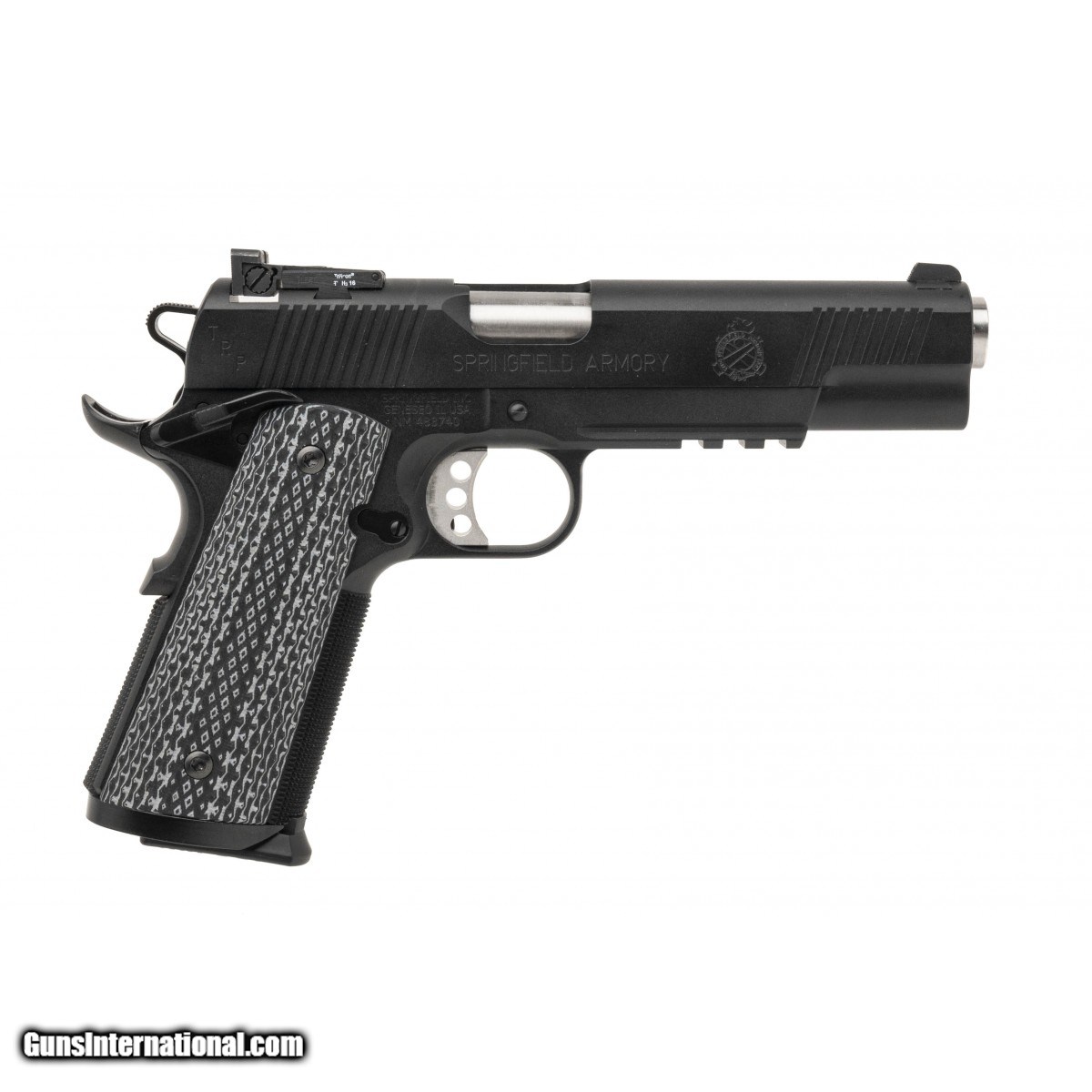 SN: NM483740. Modern production, discontinued in 2021. Semi-automatic 1911 type handgun made by Springfield. Excellent condition. Match-grade full-size model with 5"" barrel chambered for .45 ACP. Features adjustable Trijicon tritium night sights, G10 grips and three-slot picatinny rail. Black cerakote frame, slide and control finish with stainless barrel and trigger. Comes with original box and two magazines.