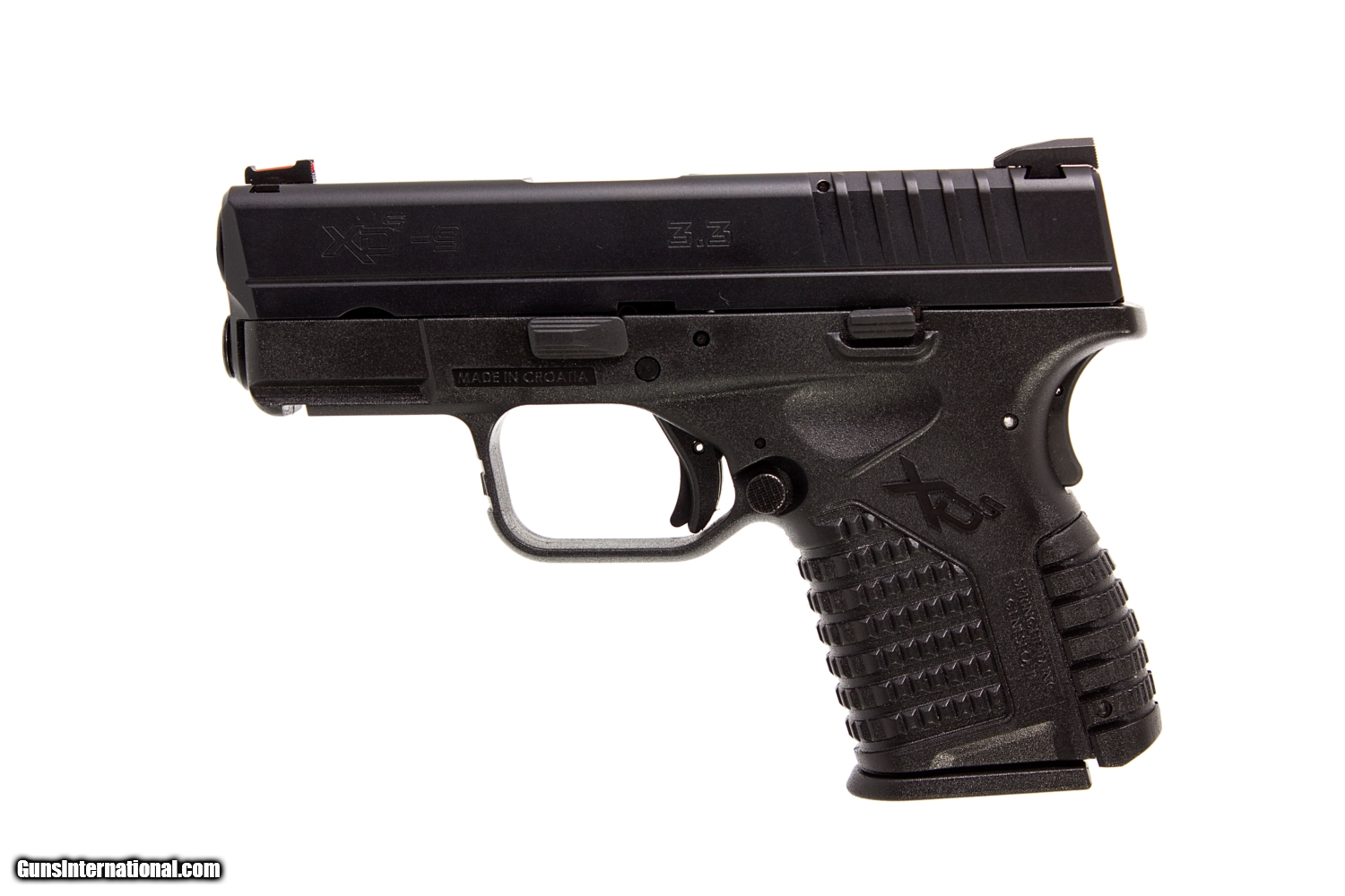 SAI XDS-9 9MM 3.25 INCH BARREL FIXED 2 DOT REAR SIGHT WITH FIBER OPTIC FRONT SIGHT . BLACK POLYMER FRAME WITH ACCESSORY RAIL AND AMBIDEXTROUS MAGAZINE RELEASE. COMES WITH CASE AND EXTRA MAGAZINES AND SPRINGFIELD GEAR. This gun is in excellent condition and is covered by Dury's Lifetime Warranty.