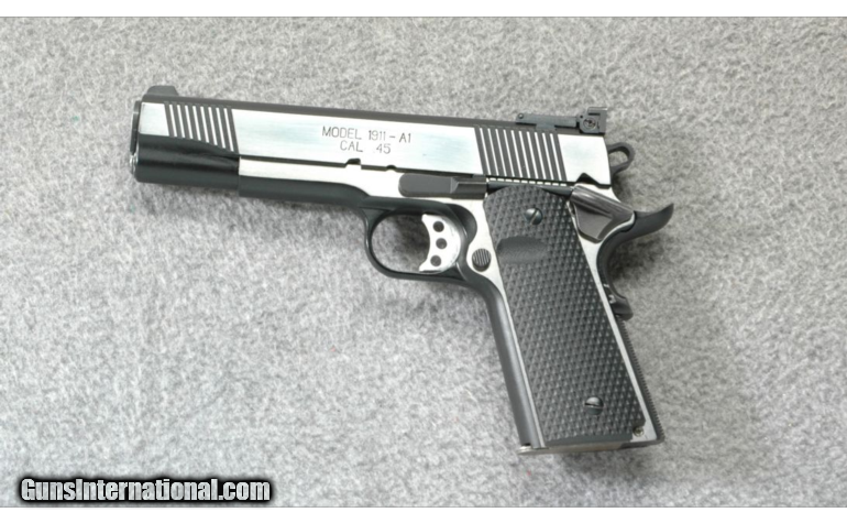 Description: This is a pre-owned Springfield 1911-A1 90 Series Black Stainless Target Model in .45 Auto. This pistol has a the carry bevel treatment, a 5 inch hammer forged premium air-gauged barrel, front and rear cocking serrations, a flat mainspring housing, a lightweight adjustable match trigger, a set of checkered hard rubber grips, and adjustable Tritium night sights. This pistol is in very good condition, it does have some light scratches on the metal surfaces, and it has the re-assembly scratch. SOLD Caliber Info: .45 Auto Metal Condition: Shows signs of light to moderate use. Wood Condition: Grips are in excellent condition. Bore Condition: Clean with bright lands. Barrels: 5 Triggers: 3 hole aluminium. Stock: Checkerd hard rubber grips. Weight: 2 1/2 lbs Sights: Adjustable Tritium night sights. Extras: Comes with a single 7 round magazine. Item Location: Glendale, AZ |