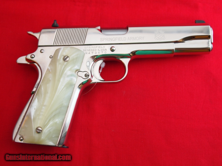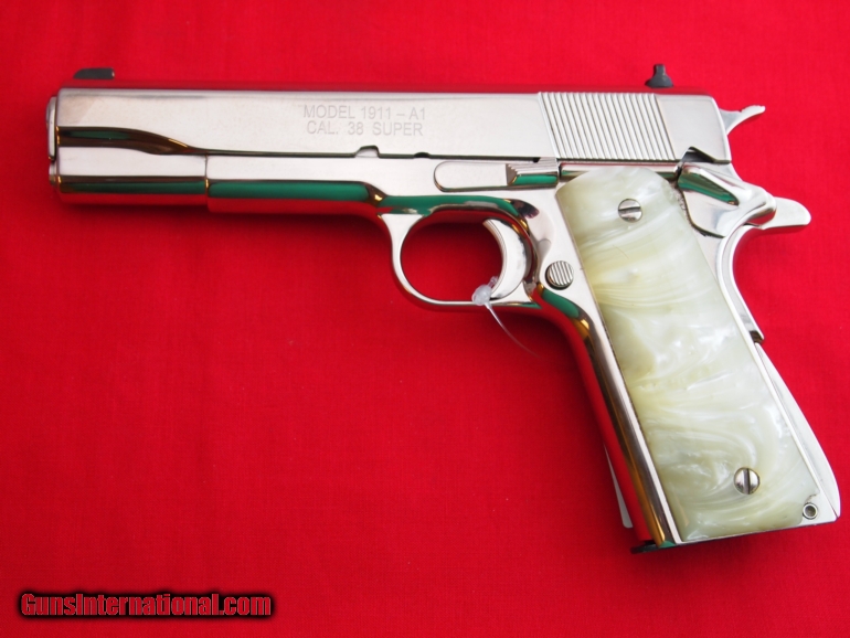 Description: Springfield 1911 A1 Nickel .38 Super, 5 inch barrel, 3 sights, grip safety, thumb safety, few handling marks, Pearlite grips, beautiful pistol. Add 3% for credit cards $25.00 S&H SOLD |