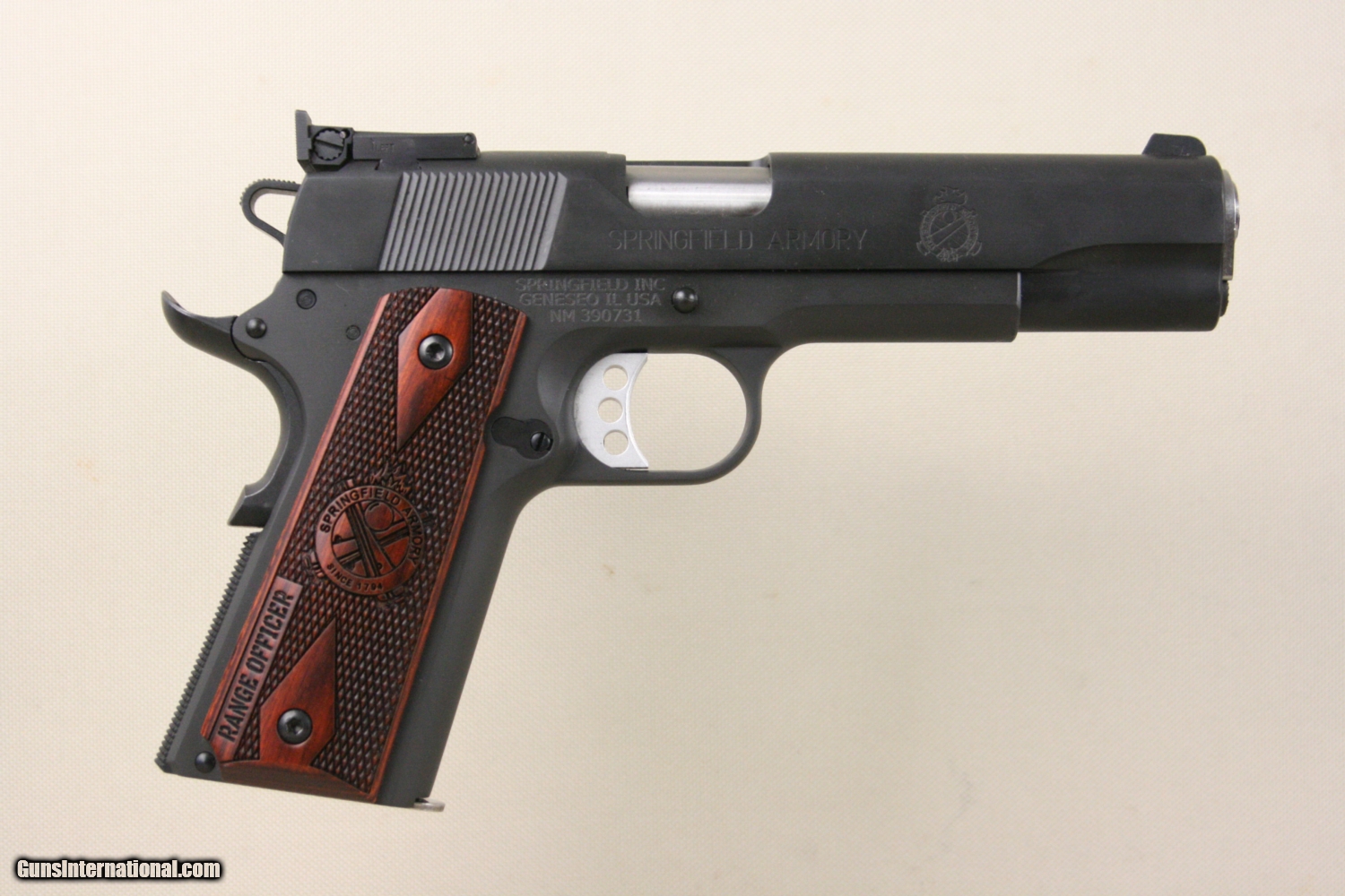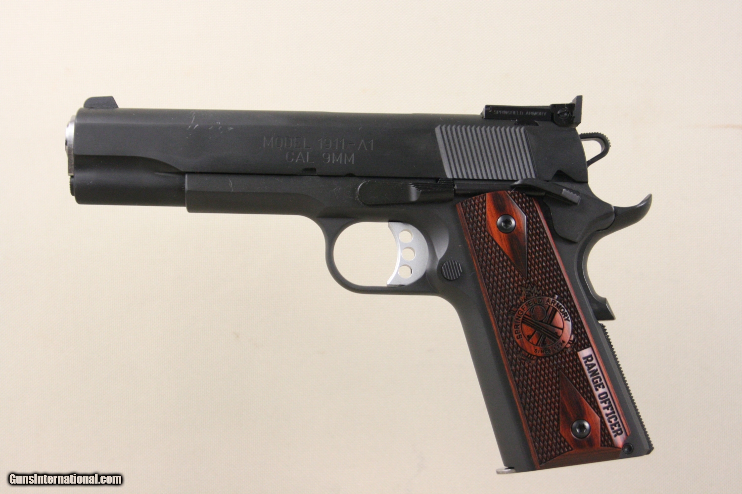Springfield 1911-A1 Range Officer 9mm has a 5 inch barrel matte blued finish slide and frame with fixed front sight and adjustable rear sight wood grips and comes with original case and gear. This gun is in excellent condition and is covered by Dury's Lifetime Warranty.