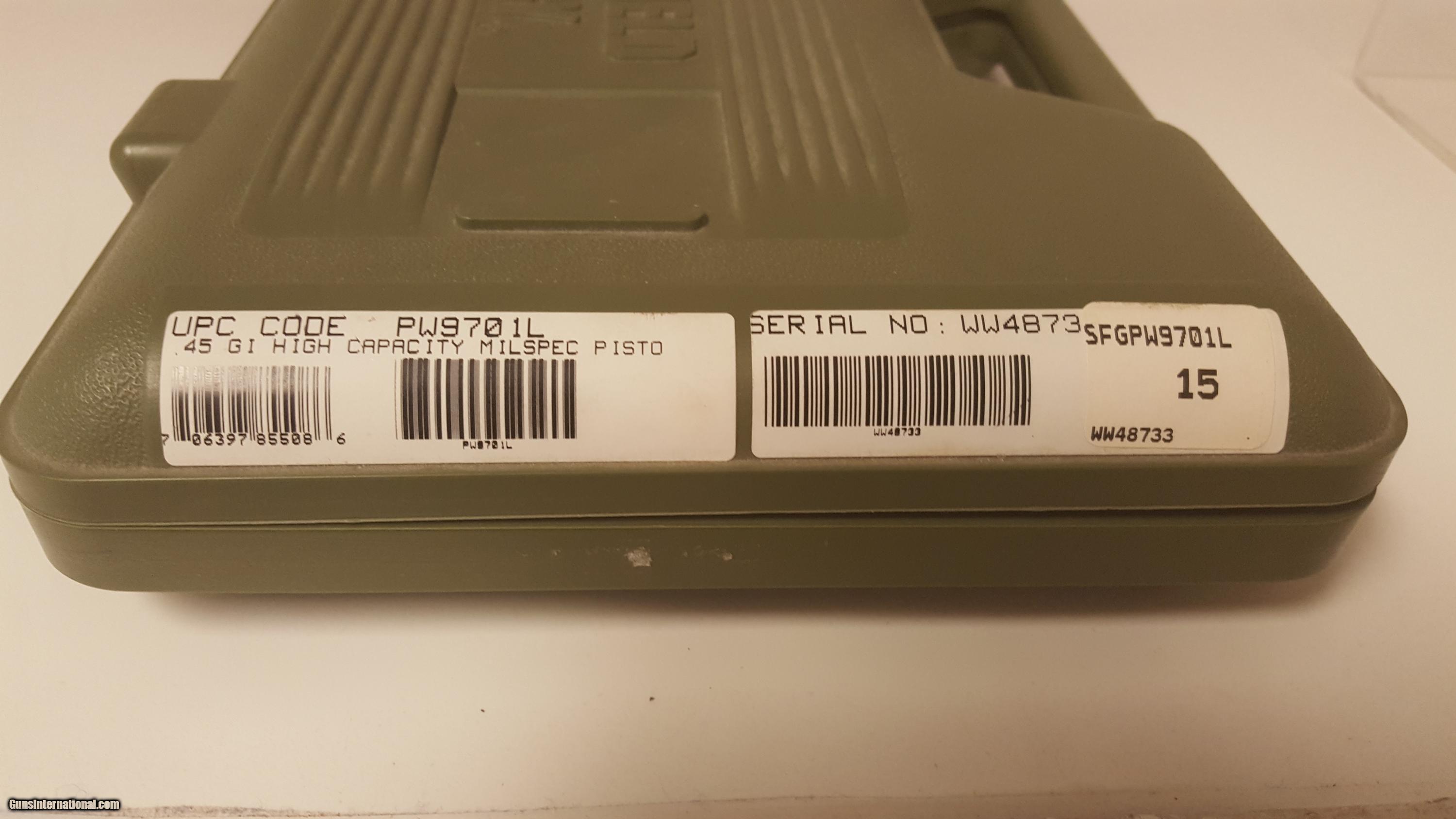 Description: Springfield (PW9701L) 1911 High Cap 45 ACP, 5" barrel , blued finish, 13rd magazine, low profile 3 dot sights, black plastic grips. Two mag"s , box. Like new 99% Add 3% for C/C S&H $25.00 SOLD Manufacturer: Springfield Armory Model: 1911 HI CAP Serial Number: WW48733 Caliber Info: 45 ACP |