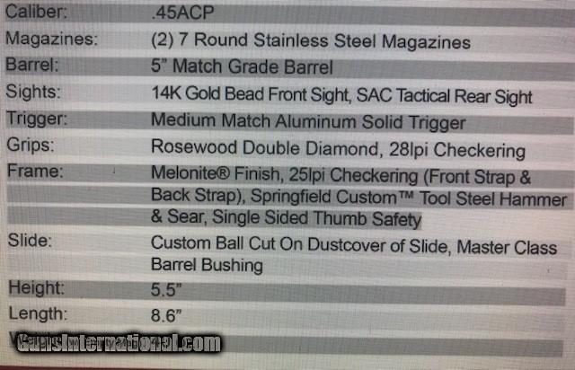 Description: For sale I have a Springfield Aficionado Master Class 1911 chambered in .45 ACP. There are only 100 of these being produced by Springfield. This pistol has so much more detail than the pics can show. It has a 14K gold bead front sight, double chekered rosewood grips, and much more. Layaway is available with 20% down and 4 equal payments. CC please add 2%. Shipping is $40 to your FFL. All offers considered. SOLD Manufacturer: Springfield Model: Master Class 1911 Caliber Info: .45ACP Condition: NEW |