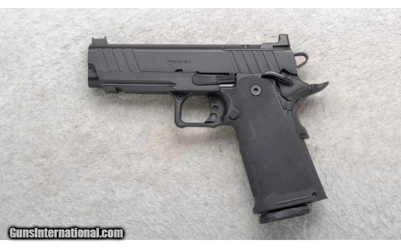 Description: This Springfield Armory Model Prodigy is a right hand semi-auto pistol in 9mm Cal. It has a 4 inch barrel with a front and rear serrated slide. A red high visibility front sight and a notch rear sight. The grip is a textured black polymer. It has a lower accessory rail. 9mm Parabellum SOLD Chambers: 17 round magazine. Metal Condition: Excellent. Bore Condition: Excellent. Barrels: 4 inch barrel with a front and rear serrated slide. Weight: 40 Oz. Sights: Green high visibility front. Notch rear. Item Location: Richfield, WI |