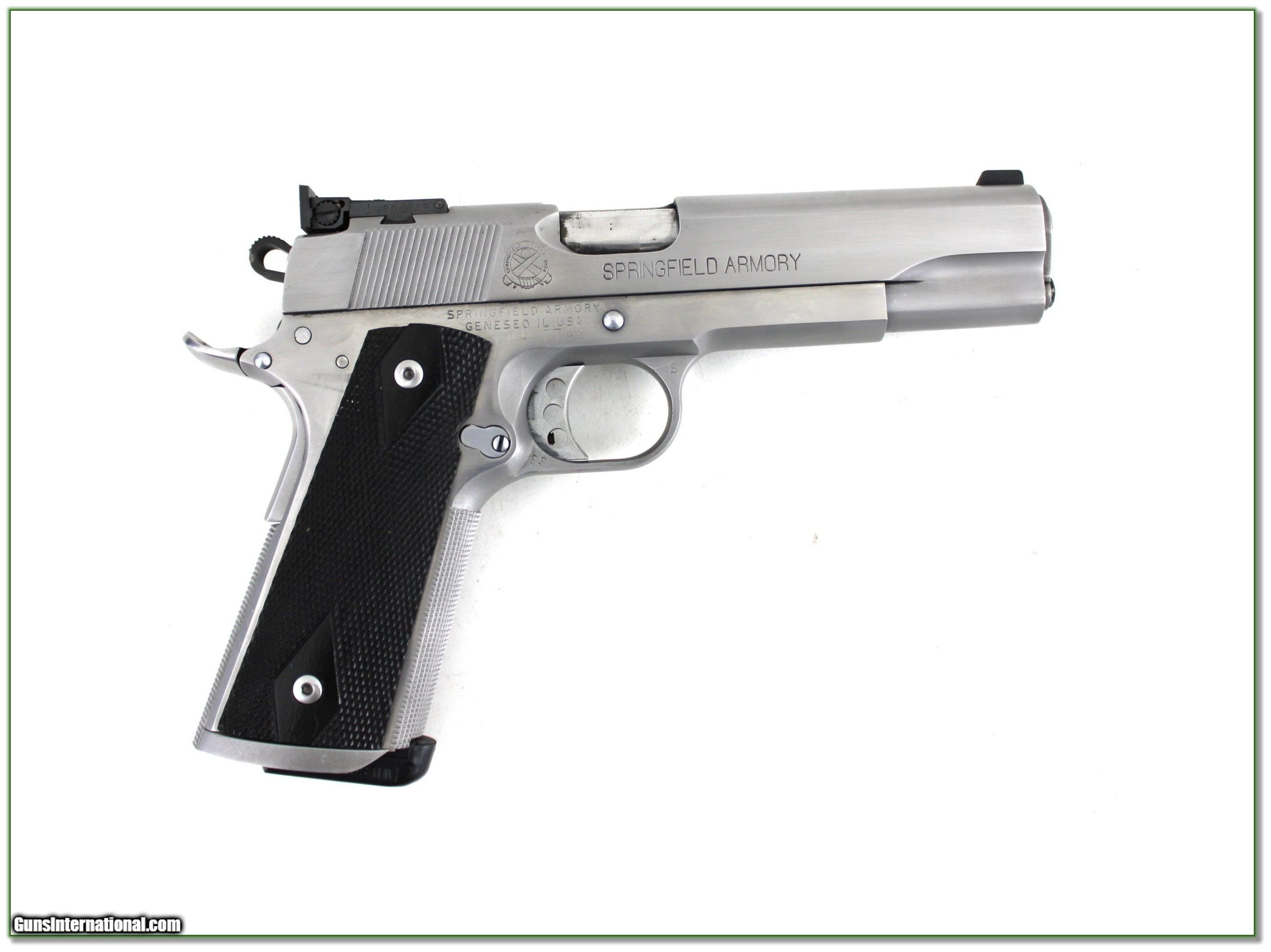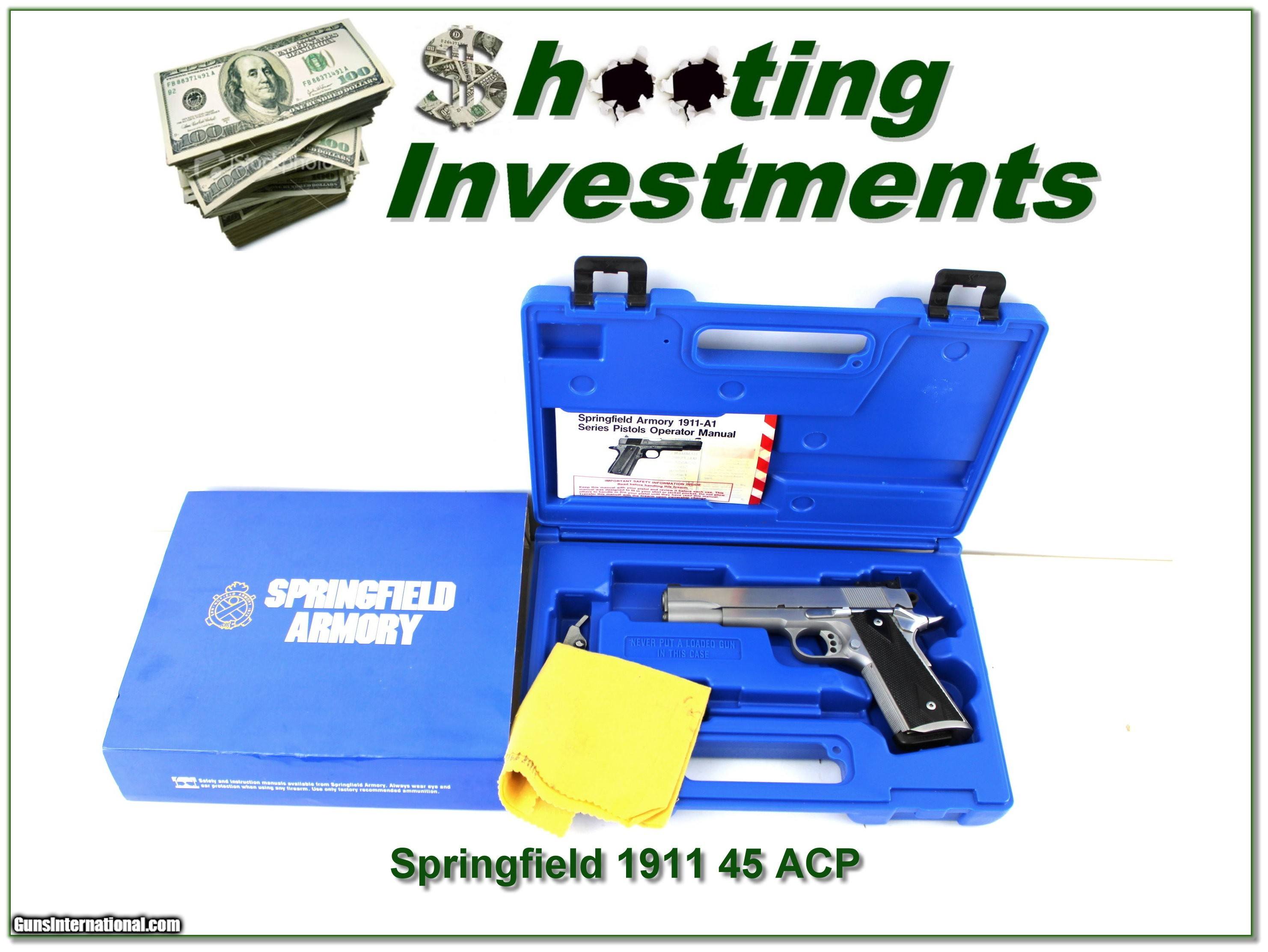 Description: This is Stainless Springfield 1911 is in very good condition. It has a 5in KART barrel with adjustable target sights and comes as seen in case. The Magazine is a Wilson Combat mag. I am selling this one on consignment and as such lay-a-way can’t be used. It does of course have the standard 3-day inspection. Shipping and insurance is $39. Please email me with any questions or larger pictures. (Consign your quality firearms with Shooting Investments for only 12%! Let me know if you have any you would like to sell!) 25-0125 Payment: Payment is by Money Order, Cashier’s Check or Personal Check. I can now also accept Credit Cards (MasterCard, Visa, Discover & American Express) with a 3% convenience fee. Shipping: The shipping charge will be listed in each description. It is $49 for most firearms. Some heavy guns or those insured for over $2000 will be higher. Shipments to Alaska and Hawaii are higher because air shipment is required. Most firearms are shipped on Tuesday and Thursday and usually in 5 days of receipt of payment. We package all shipments carefully and insure them. Optics are shipped Priority Mail and most other non-firearm shipments are shipped First Class. Returns: Our return policy is simple. If for any reason you are not pleased with your purchase, you may return your item for a full refund of purchase price. Ammunition cannot be returned. It is important to us that you are happy. Guns cannot be fired or dissembled before returning them and they must be returned in the same condition as received. Notification of a return must occur within 3 days of receipt at your dealer. Shipping, convenience and dealer fees are not refundable and are the responsibility of the buyer. Lay-a-way: If needed, we offer a 60 day lay-a-way option on most firearms. It is 1/3 now, 1/3 in 30 days and 1/3 in 60 days. Lay-a-way firearm sales are final and cannot be returned. If a lay-a-way is not completed the first payment cannot be refunded. Consigning your firearms with Shooting Investments: We will help you get top dollar for your firearms. While most local guns shops charge 20% or more, our fee is only 12% with a minimum of $100. At your local gun shop it might take months to sell. Selling on-line provides instant access to thousands of interested buyers. You won’t find any other on-line dealer willing to sell your firearms for only 12% or listing every gun on 3 separate s. Selling through an House typically costs the seller 15% and the buyer an addition 15% (so 30%) and you have to wait several months to sell and longer to receive funds. If properly priced, we will sell your firearms within a few weeks. Send us an email or give us a call and we’ll explain how easy it is for you to get top dollar. Trading: Trading for us is really just buying your gun to re-sell. If you have a gun you want to trade, please email a picture and we will let you know what we can give for it. You will always get more if we sell it for you on consignment. SOLD |