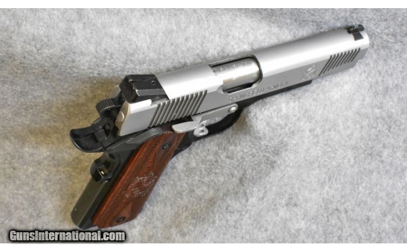 Description: Lightweight frame model. SOLD Caliber Info: .45 ACP Metal Condition: good to very good condition, a couple heavy scratches on the front strap, a few scattered light handling marks on the slide, wear under the left side slide release Wood Condition: excellent condition Bore Condition: bright and sharp Barrels: 5 inch Triggers: single, grooved, ambi safety and slide release Stock: checkered wooden Springfield grips Weight: 2 lbs Sights: dovetailed front blade Trijicon night sight, dovetailed Novak style night sight rear Extras: comes with one magazine, no box or case Item Location: Kansas City, KS |