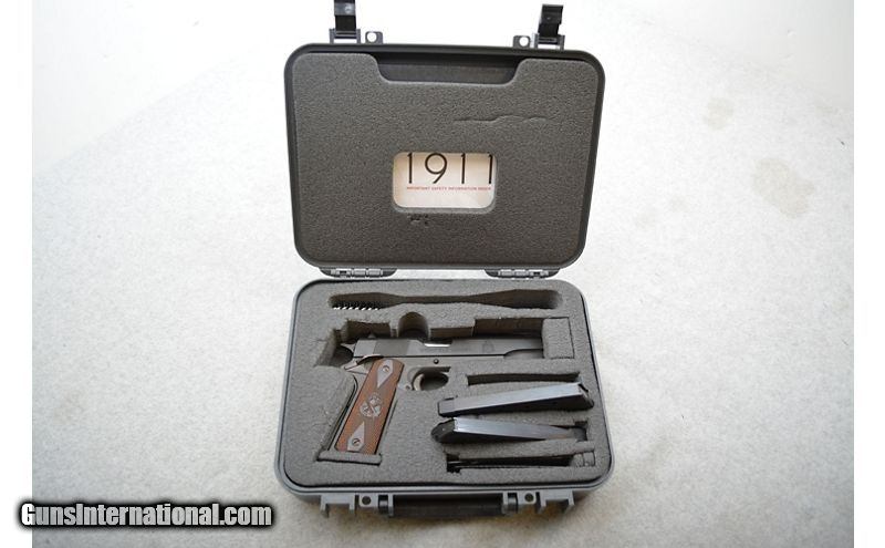 Description: Not great shape overall and appears to have been the previous owners project. The metal on the slide is covered in numerous marks, as evidenced in the pictures. These can only be seen and not felt though. The grip area of the frame in starting to develop a bit of a patina as well. There's no rust under the grips so it has at least that going for it. The previous owner did some DIY type "upgrades". The barrel bushing in not original to the firearm judging from how obscenely tight it is to the slide (pistol was disassembled for a quick clean) and there's some light rust where the bushing contacts the slide. The mainspring housing has been replaced with a lockable one. The last noticeable thing is that the safety was changed to an ambidextrous one. The one of the right side has a little play in it. Comes with the factory case and papers, original safety, an extra set of grips, belt clip, keys for the locking mainspring housing, and a total of 2 magazines. .45 ACP SOLD Chambers: Semiautomatic fed from detachable magazines. Metal Condition: Fair. Wood Condition: Grips are in good condition. Bore Condition: Excellent. Healthy shine and well-defined rifling. Barrels: 5" Stainless. Triggers: Blued metal with grooved face. Stock Dimensions: N/A Fore End: N/A Butt Pad: Checkered cocobolo grips. Black plastic grips included. Weight: 2lbs 8oz Sights: Fixed 3-dot sights with front dot and two dot rear. Chokes: N/A Item Location: Green Bay |