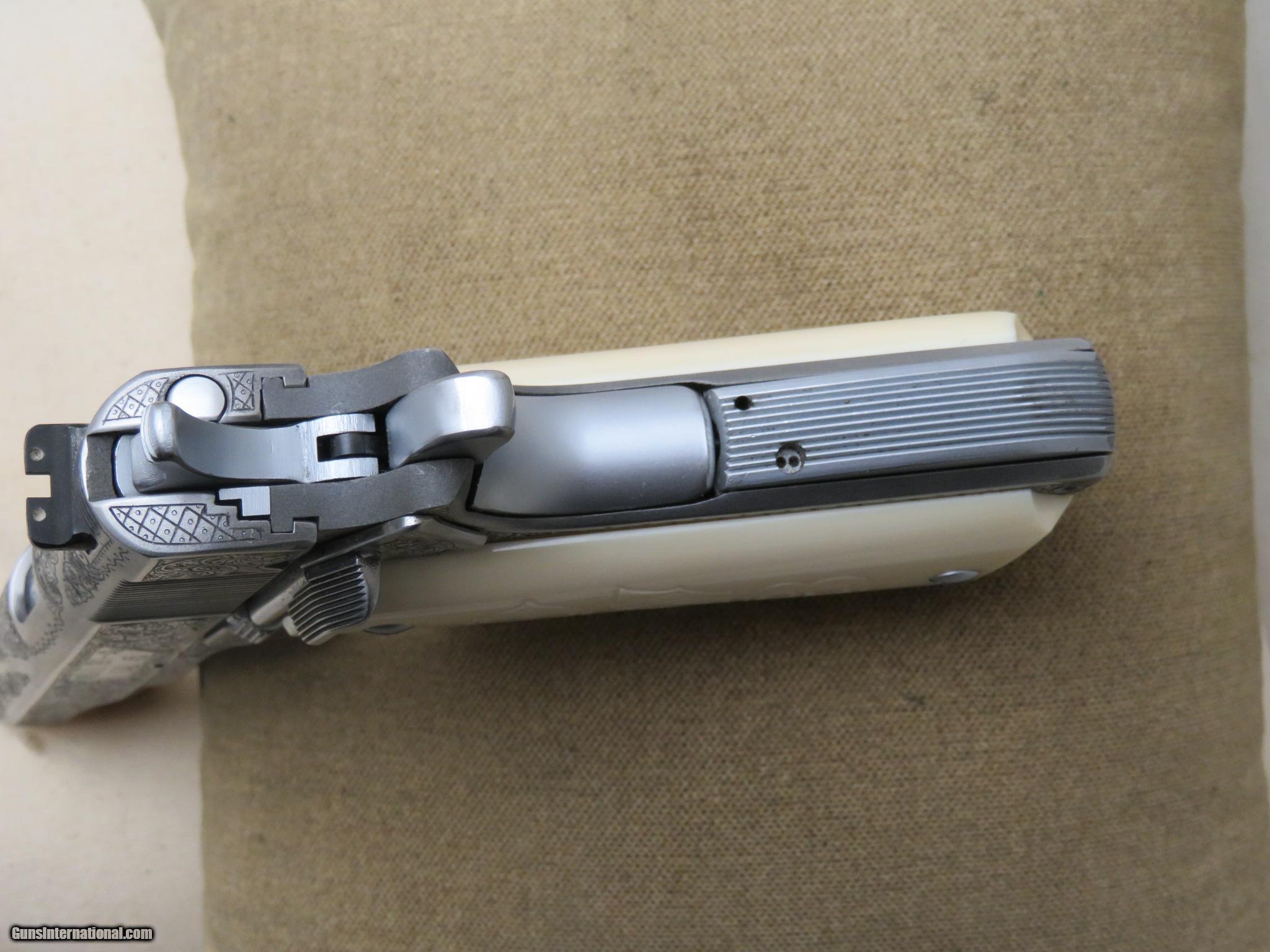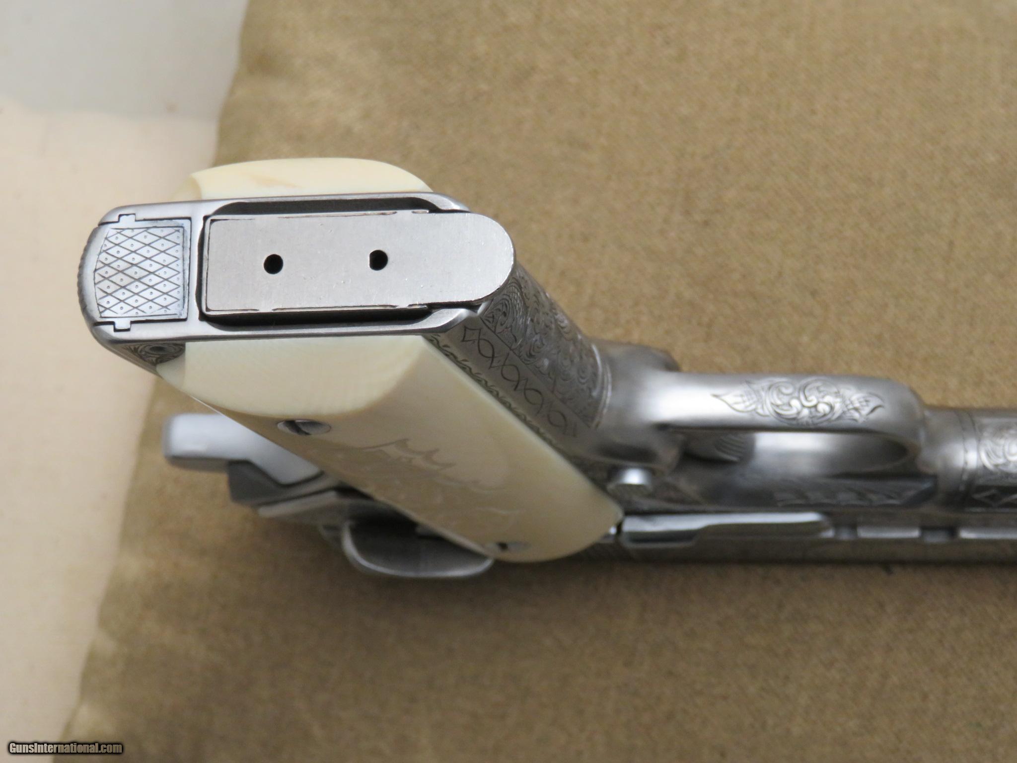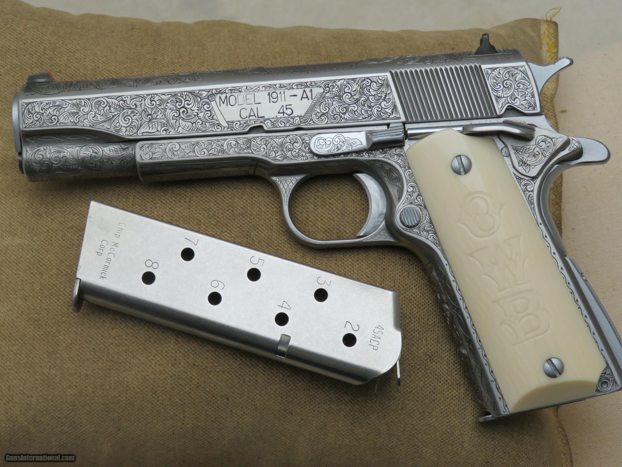 Description: Springfield Armory 1911 A1 engraved by Michael Gouse in mint condition inside and out, in case with Ivory & wood grips, with 2 McCormick magazine, serial number N470659, Plus $55 Shipping & Insurance to lower 48 states, if buying a gun buyer has to supply a copy of FFL dealer license to ship the gun to, 3 day inspection period buyer is responsible for cost of shipping both ways, Money Order or Certified check, you are responsible to make sure item is legal in you area, 985 632-3794 or 985 991-0138 8am-9pm Central Standard Time SOLD |