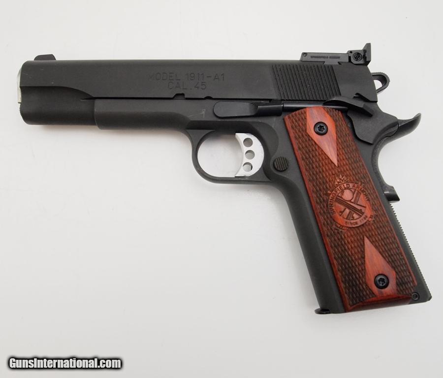 Description: Springfield Armory 1911-A1 WBox .45 ACP, 5" bbl, bright shiny bore, strong rifling, black finish, adjustable notch rear sight, blade front sight, skeletonized trigger and hammer, checkered main spring housing, and Springfield Armory Logo checkered grips. This pistol is in excellent condition. Add 3% for Credit Card Shipping $25.00 SOLD |