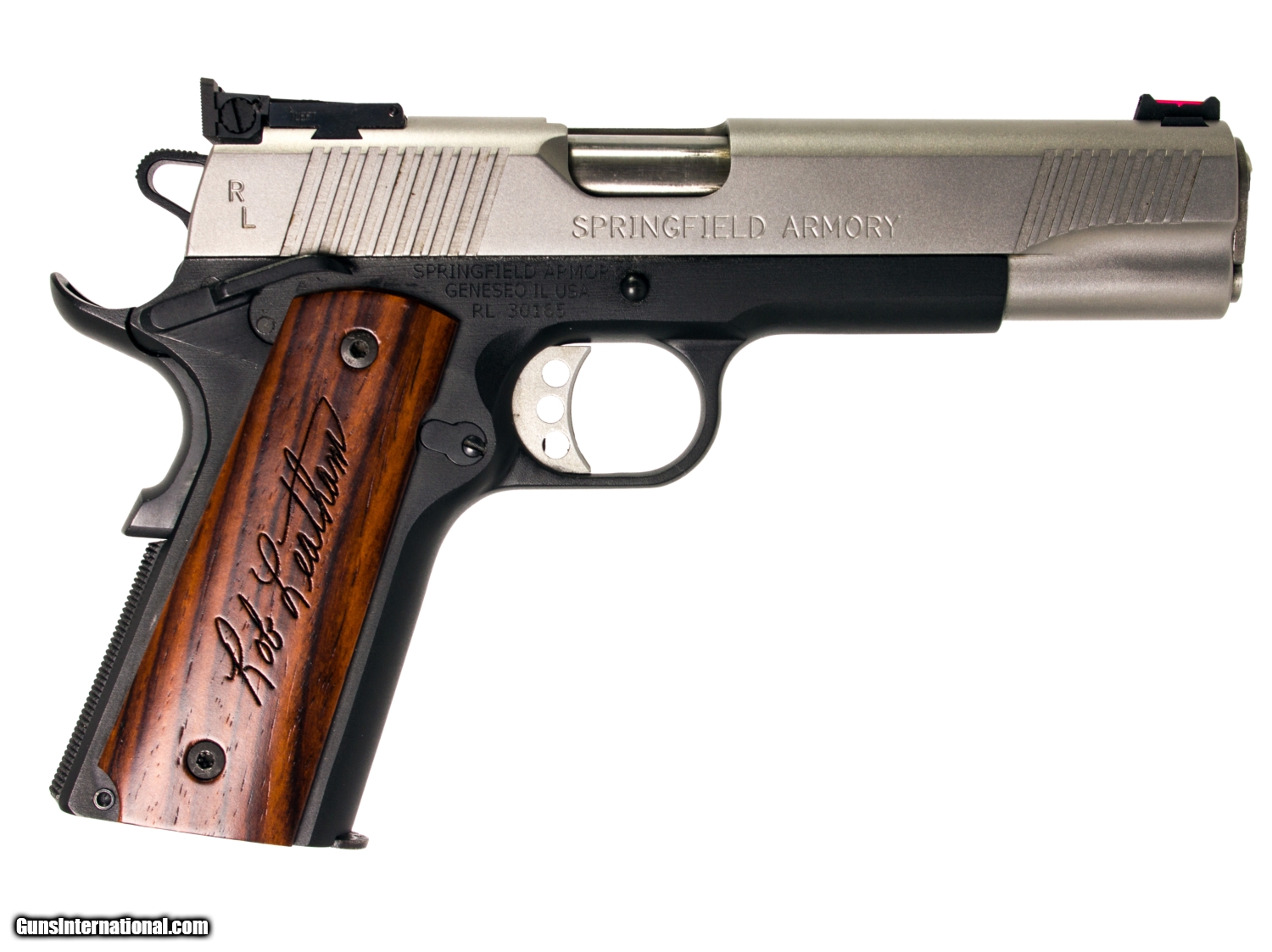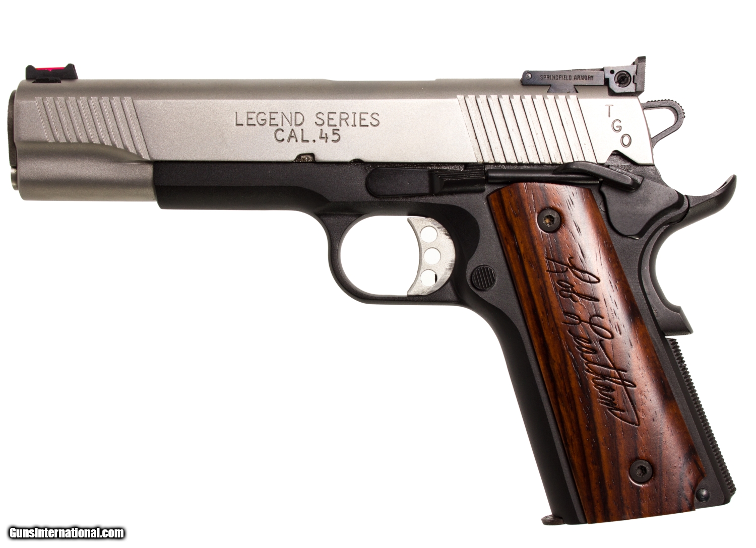 Springfield Armory 1911 Legend Series (Robert "TGO" Leathem) with adjustable rear sight and a red fiber optic sight and wood grips. Robert Jennings Leatham also known as "TGO" is a professional shooter. He is a 24-time USPSA National champion and 7-time International Practical Shooting Confederation World Champion. This gun is in excellent condition and is covered by Dury's Lifetime Warranty.