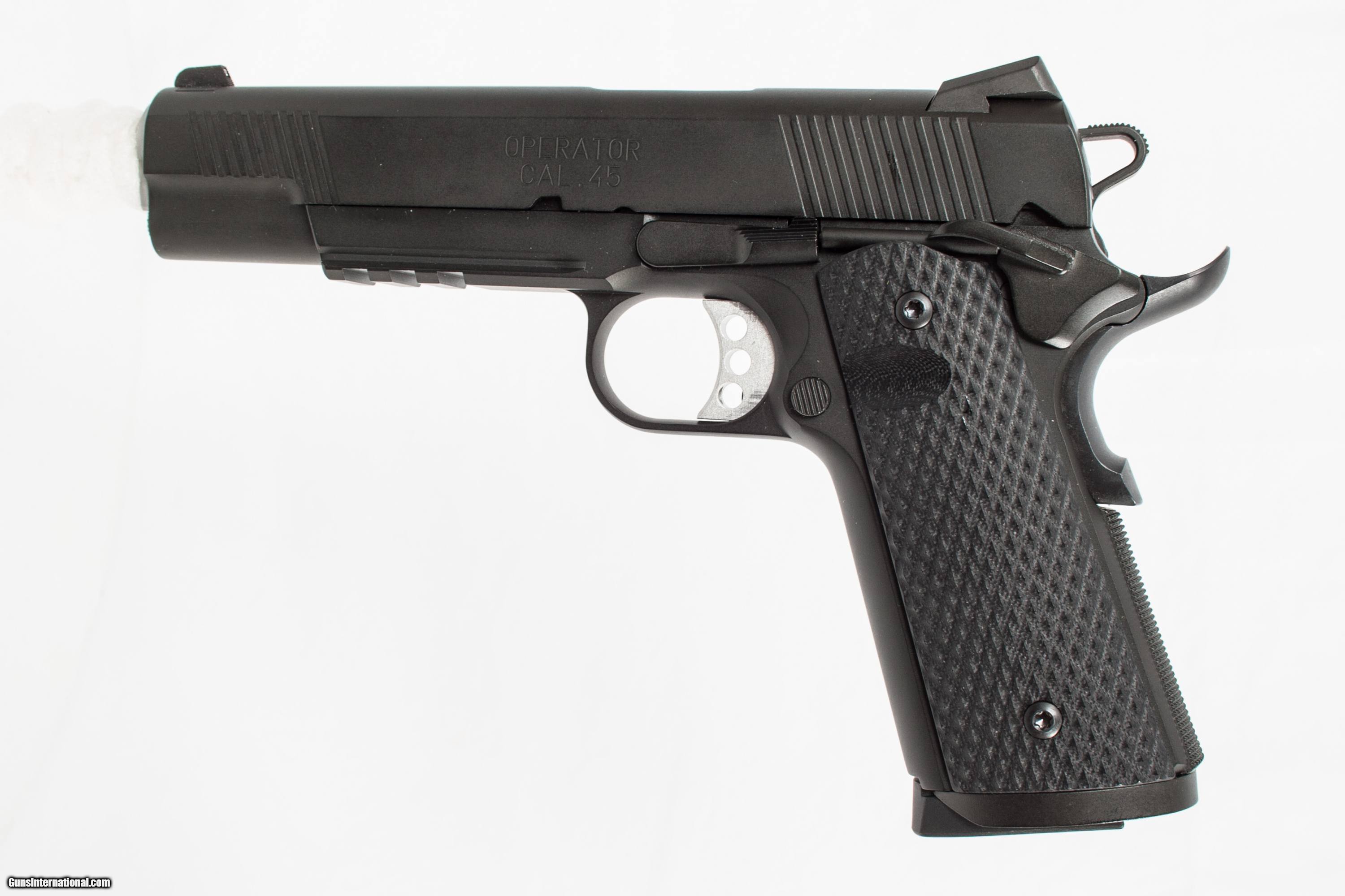 SPRINGFIELD ARMORY 1911 OPERATOR CHAMBERED IN 45ACP WITH A 5 INCH BARREL COMES WITH BOX AND SOFTCASE. THIS GUN IS IN EXCELLENT CONDITION AND IS COVERED BY DURY'S LIFETIME WARRANTY.