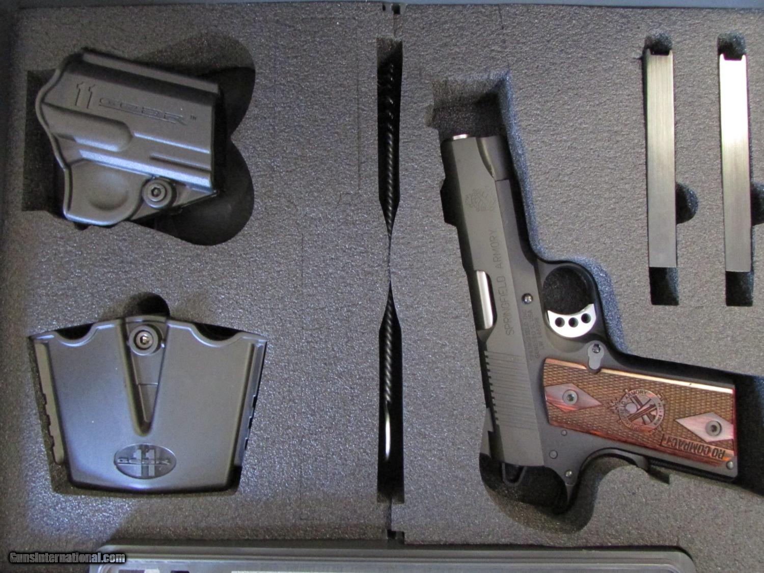 Description: Brand New in the Box, Ready to Ship! Buy It Now!! If you want a competition grade 1911 that conceals better than a full-sized pistol, the Range Officer Compact from Springfield Armory offers finely tuned performance in a smaller package. The Range Officer Compact brings the precision of a competition pistol in a small and straightforward configuration. The Range Officer Compact has the same quality forged national match frame and slide as the Trophy Match and TRP 1911s. It gets the same precision fit as these pistols, too. Add in the same match grade steel barrel, and you have a pistol that shoots well beyond its price tag. The Range Officer® Compact is topped with a fiber optic front sight and a low profile combat rear sight, so you have maximum visibility. The beavertail grip safety, extended lightweight trigger and flat mainspring housing allow the pistol to sit in your hand comfortably for long periods of time at the range. The single-sided thumb safety keeps things simple and functional. It all adds up to a pistol that will let you seriously compete in a variety of matches. The Range Officer Compact means that your favorite range pistol is now easier to carry. Are You Ready? Caliber: .45 ACP Barrel: 4" Stainless Steel Match Grade, Fully Supported Ramp, Bull Magazines: (2) 6 Round, Stainless Recoil System: Dual Spring w/ Full Length Guide Rod Sights: Fiber Optic Front & Low-Profile Combat Rear Weight (with Empty Magazine): 28.5 oz. Height: 5" Slide: Forged Carbon Steel, Parkerized Length: 7.6" Grip Type: Compact RO Double Diamond Thin Line Rosewood Frame: Forged Aluminum Alloy, Black Hardcoat Anodized Shipping to Lower 48 Only, Shipping $30.00, KNOW YOUR LOCAL AND STATE LAWS!! The above prices on this item reflect a 2.5% cash, money order, or certified check discount. This discount is not valid for credit card purchases. Add 2.5% to the total cost for credit card purchases. SOLD |
