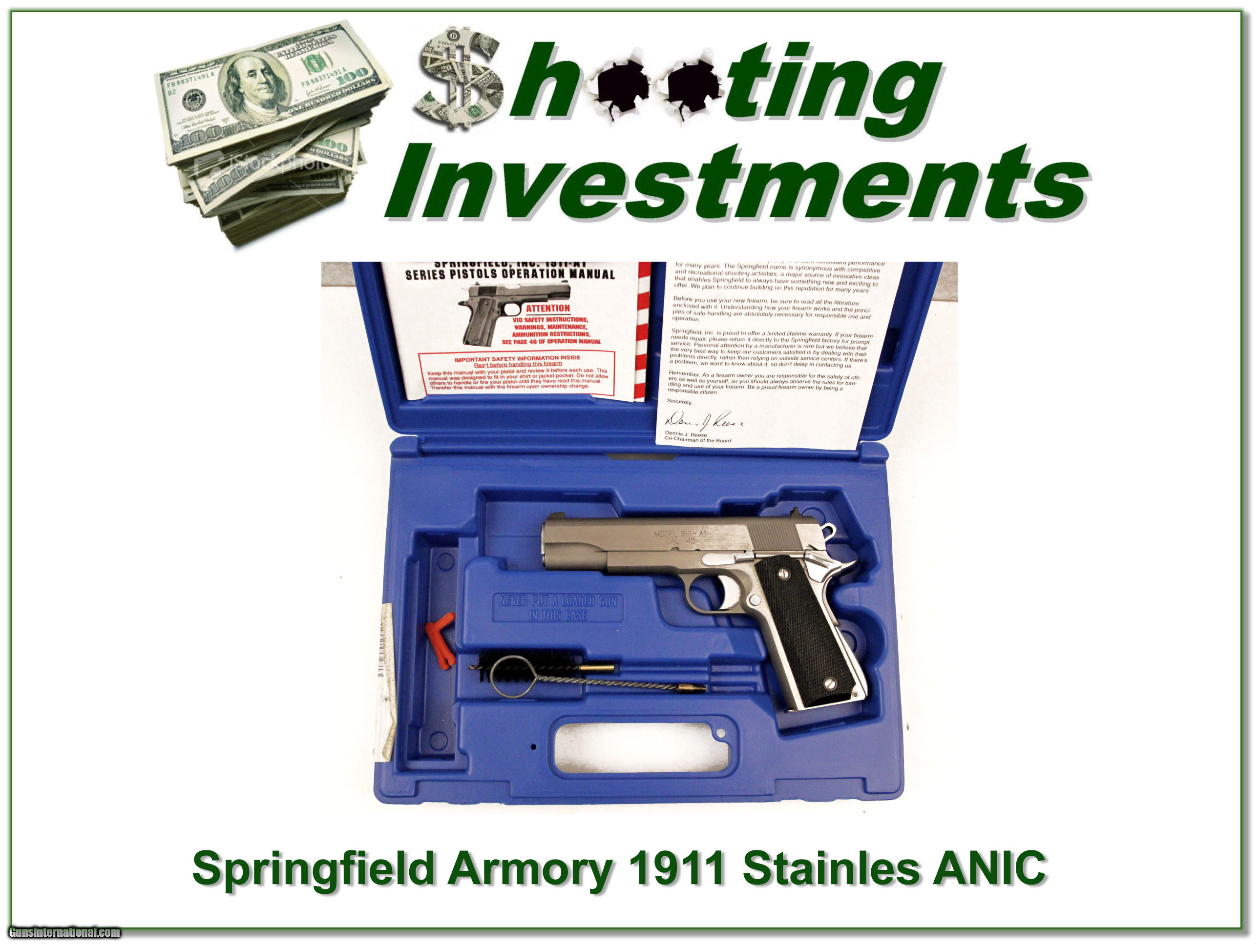 Description: This is an excellent condition Springfield Armory 1911. It is stainless and comes in original case will all papers. I am selling this one on consignment and as such lay-a-way can’t be used. It does of course have the standard 3 day inspection. Shipping and insurance is $35 or $15 more if you want it shipped in a new Plano hard case. Please email me with any questions or larger pictures. (I now consign quality firearms only 10%! Let me know if you have any you would like to sell!) [16-0568] Payment: Payment is by Money Order, Cashiers Check or Personal Check. I can now also accept MasterCard and Visa with a 3% convenience fee. PayPal can be used for some items but never firearms. Please let us know if you would like to pay via PayPal. Shipping: The shipping charge will be listed in each description. It is $35 for most guns. Some heavy guns or those insured for over $2000 will be higher. Shipments to Alaska and Hawaii are higher because air shipment is required. Most firearms are shipped within 5 days of receipt of payment. We prefer shipping at the beginning of the week to avoid firearms in transit over weekends. We package all shipments carefully and insure them for the full purchase price, rounded up to the next $100. In the unlikely event that damage occurs, it is important that you save all packaging material for the claims process. Optics are shipped Priority Mail and most other non-firearm shipments are shipped First Class. Returns: Our return policy is simple. If for any reason you are not pleased with your purchase, you may return your item for a refund. The only exception is ammunition, it cannot be returned. It is important to us that you are happy. Guns cannot be fired or dissembled before returning them and must be returned in the same condition as received. Notification of a return must occur with-in 3 days of receipt at your dealer. Shipping, convenience and dealer fees are not refundable and are the responsibility of the buyer. Lay-a-way: If needed, we offer a 60 day lay-a-way option on most firearms. It is 1/3 now, 1/3 in 30 days and 1/3 in 60 days. Lay-a-way firearm sales are final. Consigning your firearms with Shooting Investments: We will help you get top dollar for your firearms. While most local guns shops charge 20% or more, our fee is only 10% with a minimum of $50. At your local gun shop it might take months to sell. Selling on-line provides instant access to thousands of interested buyers. You won’t find any other on-line dealer willing to sell your firearms for only 10% or listing every gun on 4 separate s. Selling through an House typically costs the seller 15% and the buyer an addition 15% (so 30%) and you have to wait several months to sell and longer to receive funds. If properly priced, we will sell your firearms in a week or two. Send us an email or give us a call and we’ll explain how easy it is for you to get top dollar. Trading: We collect guns and usually just trade for guns we want to add to our collections. We often sell guns for others wanting to purchase one of ours. We find this the most fair to both of us. Our Commission is only 10% and we hold the gun you want until yours sells. Please contact us if you want to sell one of yours to buy one of ours. Help for California Buyers: We are happy to ship to California. It is the buyer’s responsibility to make sure any item you buy is legal in your state. We are also happy to help with your purchase of a firearm from someone other than us. If you see a gun you would like to buy but the seller can’t or won’t ship to California we can help. You buy the gun and have it shipped to us. We’ll then ship it to your California dealer. The cost for this service is only $30 + shipping. Let me know if we can help! SOLD |