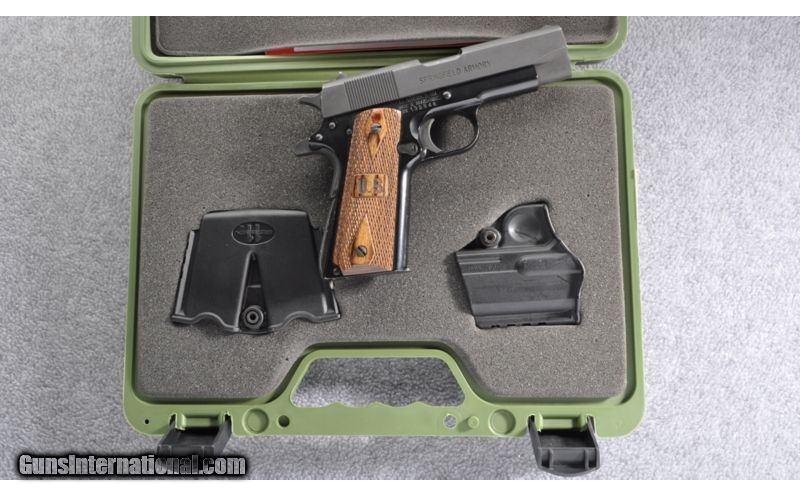 Description: Made in Brazil by IMBEL for Springfield Armory SOLD Caliber Info: .45 Automatic Colt Pistol Metal Condition: Very good showing slight carry wear at frame & slide Wood Condition: Grip panels show very little wear Bore Condition: Bright & sharp Barrels: 4" bushingless Triggers: Single Action Stock: Checkered laminate double diamond pattern Weight: 32 oz Sights: Low profile fixed Extras: Factory case with accessories Item Location: Grand Junction, CO |
