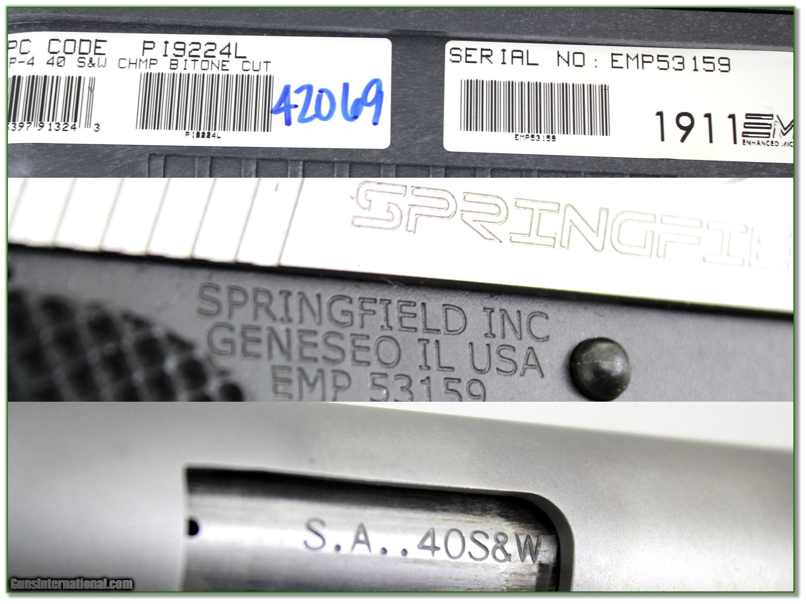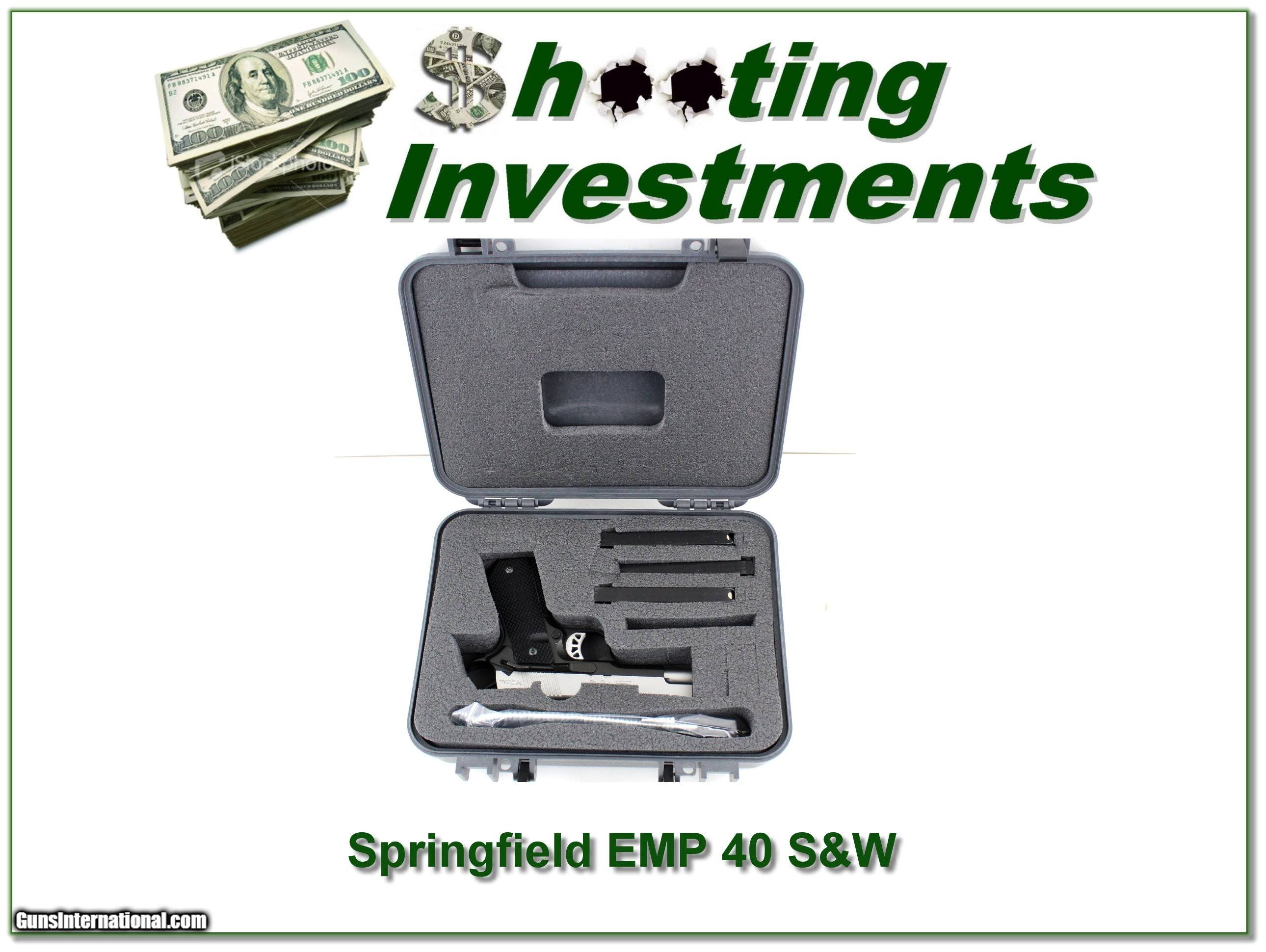 Description: This is an excellent condition Springfield Armory EMP in 40 S&W. It is 2-tone and comes with 4 magazines and factory case. I am selling this one on consignment and as such lay-a-way can’t be used. It does of course have the standard 3-day inspection. Shipping and insurance is $39. Please email me with any questions or larger pictures. (Consign your quality firearms with Shooting Investments for only 12%! Let me know if you have any you would like to sell!) 23-0993 Payment: Payment is by Money Order, Cashier’s Check or Personal Check. I can now also accept Credit Cards (MasterCard, Visa, Discover & American Express) with a 3% convenience fee. Shipping: The shipping charge will be listed in each description. It is $49 for most firearms. Some heavy guns or those insured for over $2000 will be higher. Shipments to Alaska and Hawaii are higher because air shipment is required. Most firearms are shipped on Tuesday and Thursday and usually in 5 days of receipt of payment. We package all shipments carefully and insure them. Optics are shipped Priority Mail and most other non-firearm shipments are shipped First Class. Returns: Our return policy is simple. If for any reason you are not pleased with your purchase, you may return your item for a full refund of purchase price. Ammunition cannot be returned. It is important to us that you are happy. Guns cannot be fired or dissembled before returning them and they must be returned in the same condition as received. Notification of a return must occur within 3 days of receipt at your dealer. Shipping, convenience and dealer fees are not refundable and are the responsibility of the buyer. Lay-a-way: If needed, we offer a 60 day lay-a-way option on most firearms. It is 1/3 now, 1/3 in 30 days and 1/3 in 60 days. Lay-a-way firearm sales are final and cannot be returned. If a lay-a-way is not completed the first payment cannot be refunded. Consigning your firearms with Shooting Investments: We will help you get top dollar for your firearms. While most local guns shops charge 20% or more, our fee is only 12% with a minimum of $75. At your local gun shop it might take months to sell. Selling on-line provides instant access to thousands of interested buyers. You won’t find any other on-line dealer willing to sell your firearms for only 12% or listing every gun on 3 separate s. Selling through an House typically costs the seller 15% and the buyer an addition 15% (so 30%) and you have to wait several months to sell and longer to receive funds. If properly priced, we will sell your firearms within a few weeks. Send us an email or give us a call and we’ll explain how easy it is for you to get top dollar. Trading: Trading for us is really just buying your gun to re-sell. If you have a gun you want to trade, please email a picture and we will let you know what we can give for it. You will always get more if we sell it for you on consignment. SOLD |