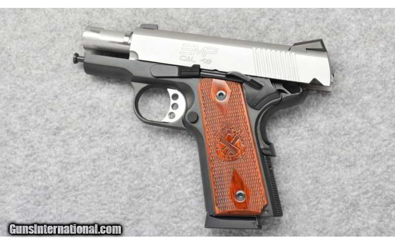 Description: Springfield Armory EMP Bi-Tone in 40 S&W. Alloy Frame, Stainless Steel Slide, Ambi.Safeties, High Quality Sights. As New in Factory Box. SOLD Caliber Info: 40 S&W Metal Condition: Excellent Wood Condition: Excellent Bore Condition: Bright and Sharp Barrels: 3 Inch Match Grade Stock: Checkered Coco Bolo Weight: 33 Ozs Sights: Dovetailed Trijicon Front and Rear Sight Item Location: Buda, TX |
