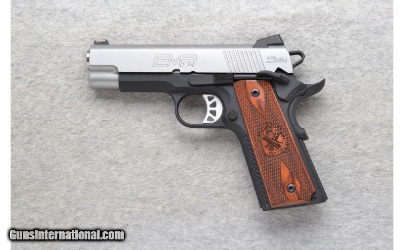 Description: This Springfield Armory Model EMP4 is a semi-auto 1911 style pistol in 9mm Cal. It has a 4 inch barrel, satin stainless steel slide, black frame, grooved skelton trigger and diamond checkered walnut grip panels. In overall excellent condition it comes as is in a hardcase with Owners Manual, gun lock, gun holster, magazine holster and two single stack magazines. SOLD Caliber Info: 9mm Chambers: 9 shot magazine. Metal Condition: Excellent. Wood Condition: Excellent. Bore Condition: Excellent. Barrels: 4 inches. Satin stainless steel slide. Triggers: Grooved. Skelton. Stock: Diamond checkered walnut grip panels with Springfield Armory logo. Weight: 28 oz. Sights: Red bar high visibility front. Notch rear with white dots. Item Location: Richfield, WI |