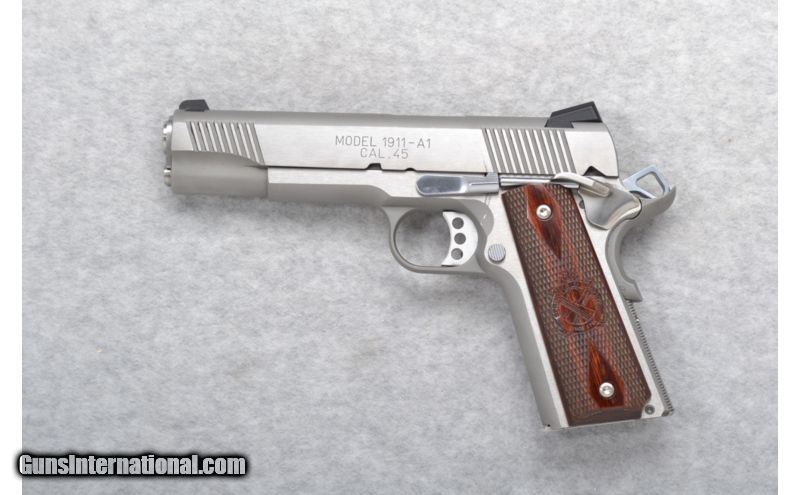 Description: SOLD Caliber Info: .45 Auto Chambers: 7 shot magazine. Metal Condition: Excellent with minor handling marks. Wood Condition: Excellent. Bore Condition: Excellent. Barrels: 5 inches. Matte stainless steel slide. Triggers: SA Stock: Diamond checkered hardwood grip panels with Springfield Armory logo. Weight: 42 oz. Sights: Blade front. Notch Rear. 3 white dot. Extras: Hard Case Item Location: Richfield, WI |