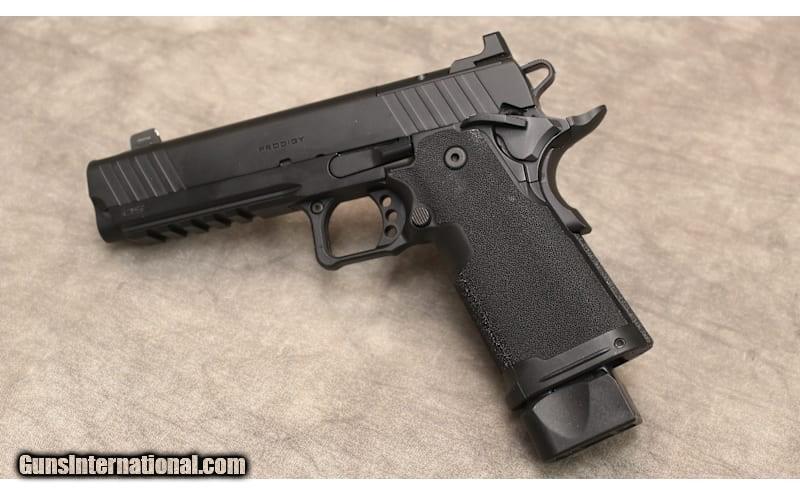Description: The Prodigy Comp from Springfield Armory® takes the proven 1911 platform and enhances it with double-stack capacity and a performance-driven feature set. Reconfigured around a double-stack magazine, the polymer grip module mounts to a forged steel frame, offering capacities of 17+1 and 20+1. The AOS-compatible slide and barrel assembly is integrally compensated to reduce muzzle rise, while a Picatinny rail is ready to accept today's most popular accessories. The Prodigy Comp combines the most beloved characteristics of the 1911 with modern capacity for unrivaled performance. 9mm Luger SOLD Chambers: 9mm NATO Metal Condition: Like New Bore Condition: Like New Barrels: 5 Inches Weight: 2LBS Item Location: Broken Arrow, OK |