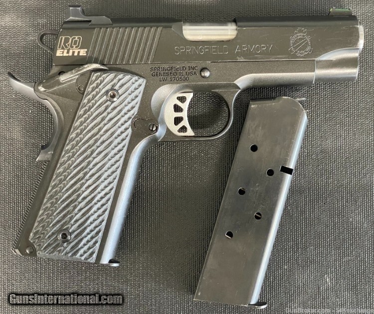 Description: Guns Listing ID: 969706 THIS IS A USED FIREARM!!! Springfield Armory 1911 RO Elite, .45 ACP, 7+1, 4\" Barrel, x2 Magazines Chambered: .45 ACP Capacity: 7+1 4\" Barrel/ 7.5\" OAL Semi-Automatic Steel Frame and Steel Slide Standard 2-DOT (white) Rear & Hi-Viz (green) Front Sights This is for the Pistol, x2 Magazines ONLY!!! This Pistol is in GOOD CONDITION!!! With OBVIOUS SIGNS of wear & tear, including holster wear. Due to occasional usage and carry. There are signs of dings, scuffs, and scratches within the steel slide and frame. Mostly on the slide, in the matte finish. Same with the holster wear. But nothing deep or serious, & ABSOLUTELY NO SIGNS OF VISIBLE RUST OR CORROSION. The safeties on either side also show scuffing, due to laying the gun down on its side during range time (SEE PICTURES). Please refer to the pictures for a more detailed reference of wear. The rifling within the barrel is very crisp, clean and visible as well. This pistol has a low to moderate round count. The listing is for the Pistol, x2 magazines ONLY!!! SOLD Manufacturer: SPRINGFIELD ARMORY Model: RO ELITE COMPACT Caliber Info: .45 ACP Condition: Used - Non-Certified Barrels: 4 BARREL |