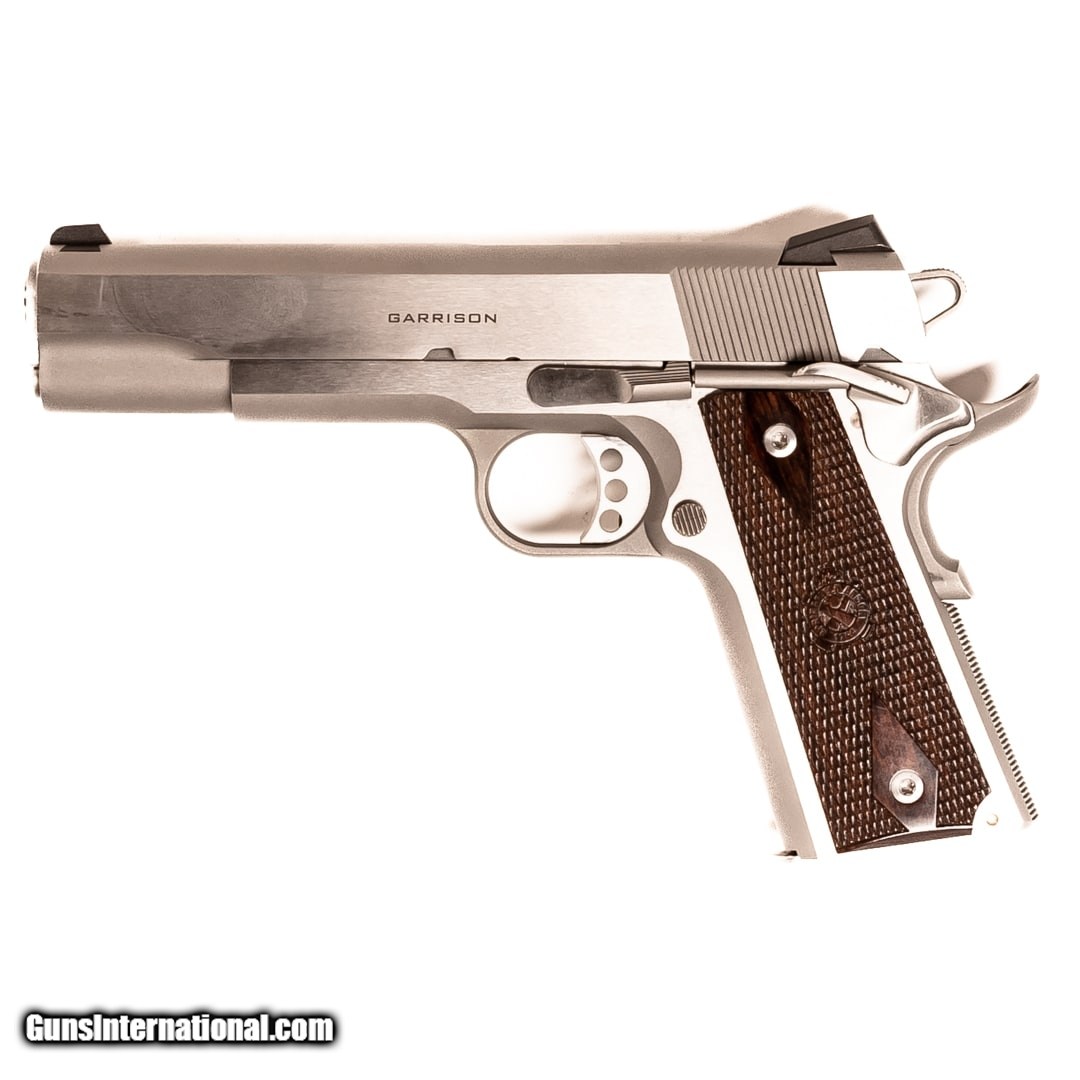 Description: Guns Listing ID: 671458 Featuring forged materials and heirloom-quality construction, the Garrison 1911 combines modern materials and design with a heritage spanning back more than a century. Available with classic hot salt blued carbon steel or rust-resistant stainless steel construction, the Garrison is a rock-solid 1911 that gives you a host of modern upgrades along with the strength to provide a lifetime of service. For those who respect tradition and demand the best, the Garrison stands ready. This is the 9mm Stainless-steel version. 2-9 round magazines, the original case, soft case, and a manual are included. Get the best bang for your buck when you get a Certified Used Firearm . When you see the Certified Used stamp on any of our firearms, you can be confident that you’re getting exactly what you want – a gun only in very good to excellent condition and held to the highest quality standard. All Certified Used Guns come with a ‘no questions asked’ return policy . PLUS, ALL CERTIFIED USED GUNS SHIP FREE! SOLD Manufacturer: SPRINGFIELD ARMORY Model: SPRINGFIELD ARMORY GARRISON Caliber Info: 9MM LUGER (9X19 PARA) Condition: Used - Certified Barrels: 5 barrel Finish: BLACK |