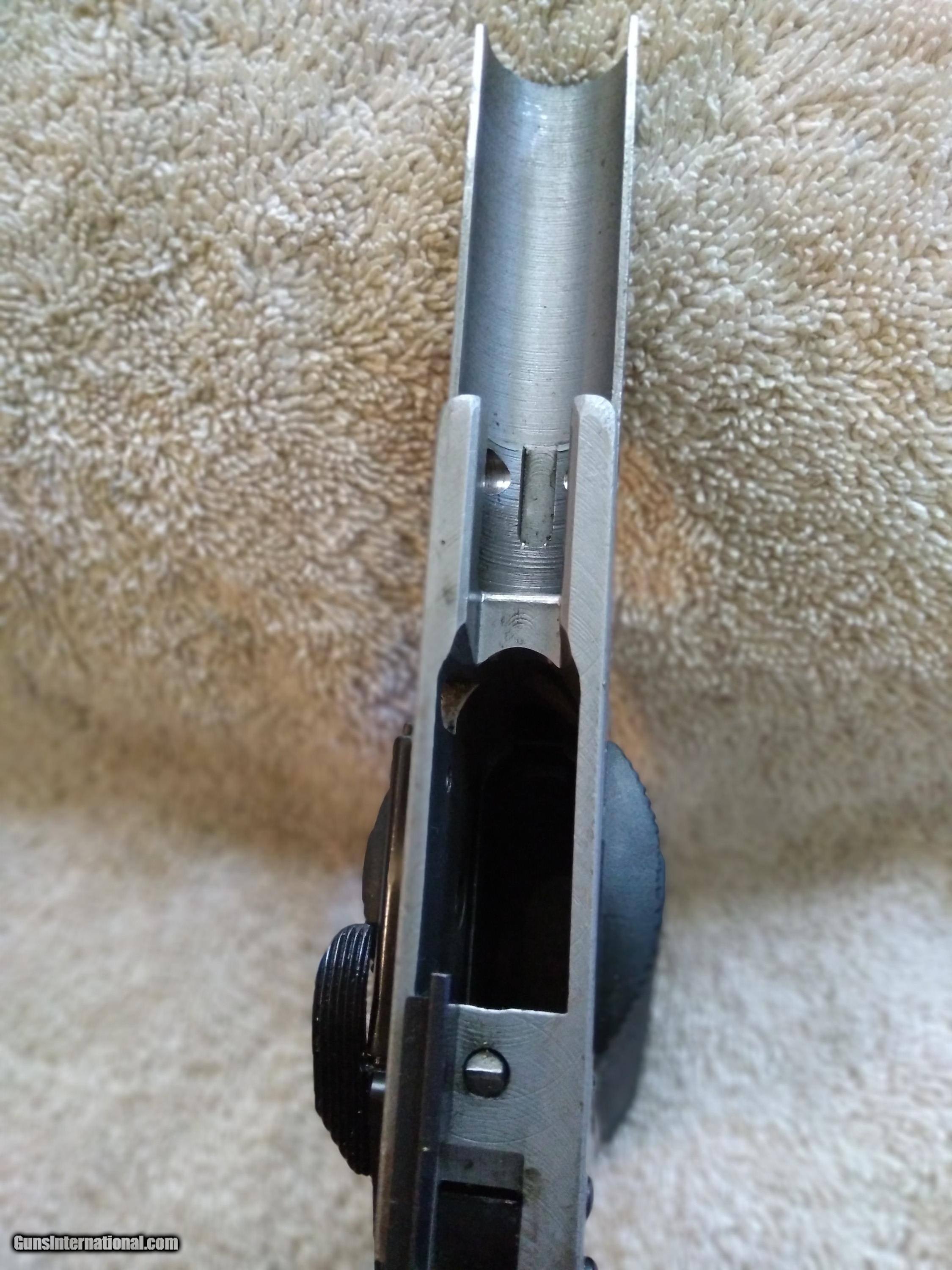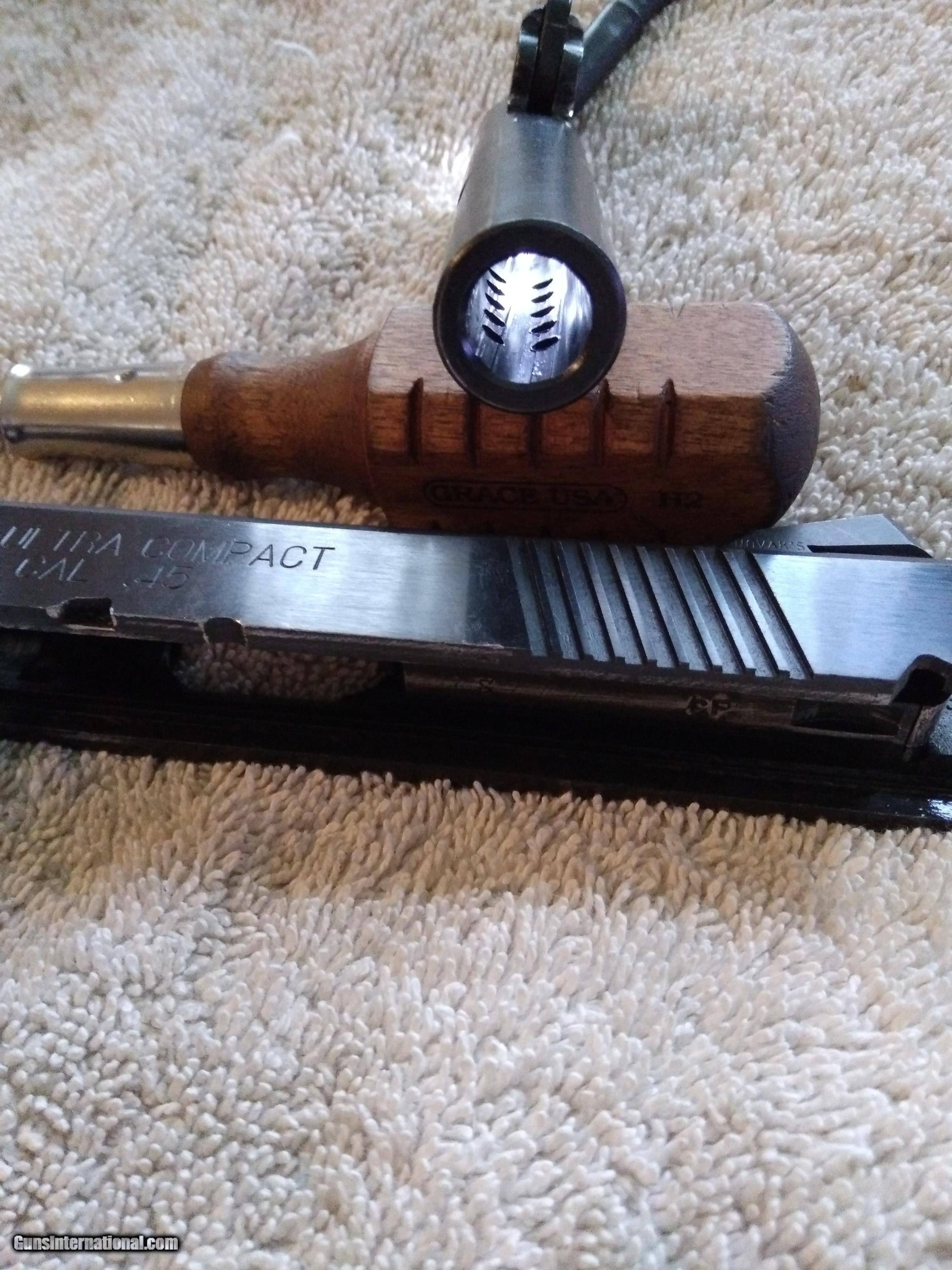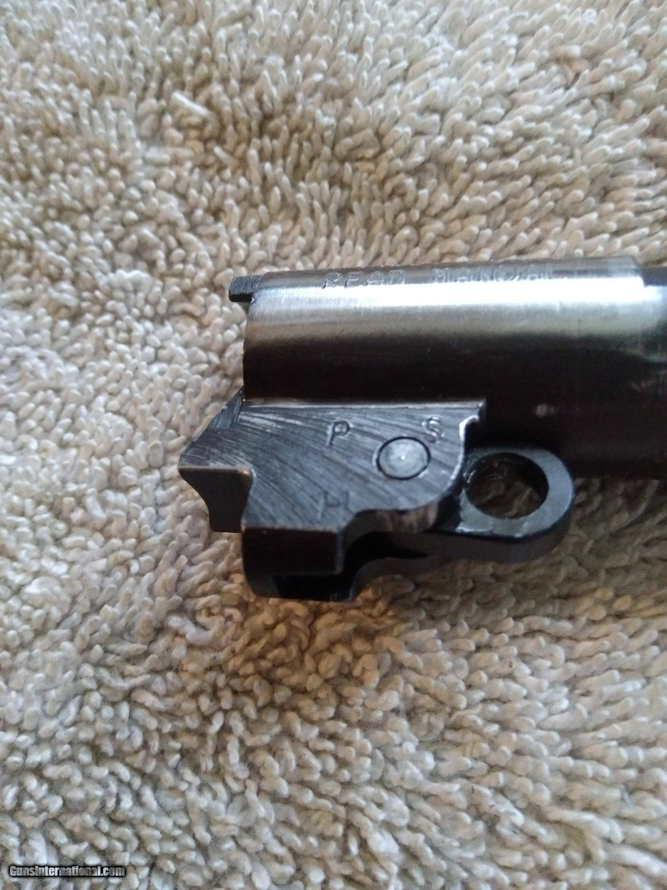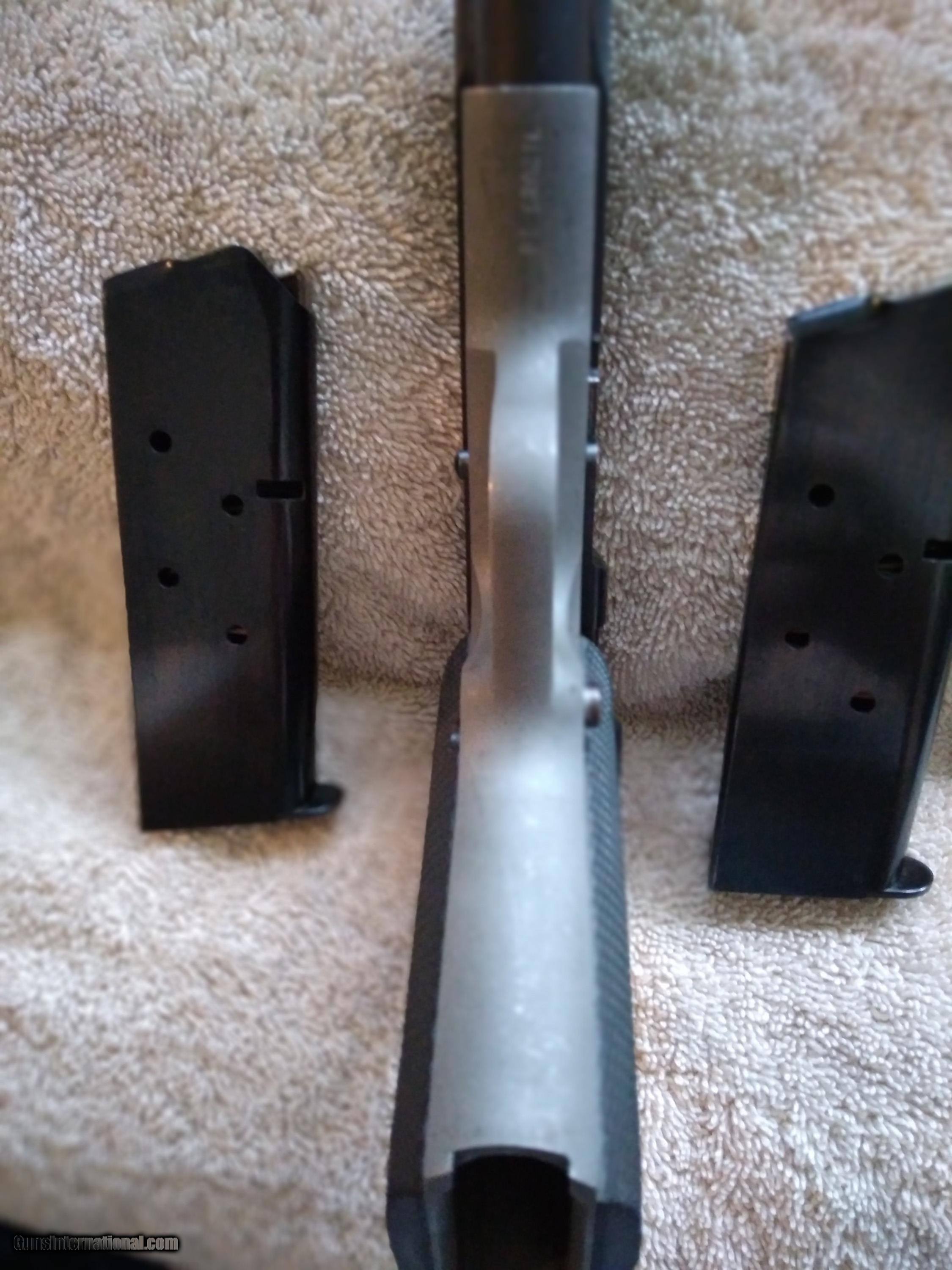 Description: SPRINGFIELD ARMORY PORTED V-10 S/N N411179 STAINLESS STEEL FRAME AND SLIDE SLIDE IS ULTRA COMPACT PORTED V10 WITH POST FRONT SIGHT AND A NOVAK U NOTCH WINDAGE ADJUSTABLE REAR SIGHT BEAVERTAIL GRIP SAFETY THUMB SAFETY SKELETONIZED HAMMER AND THREE HOLE TRIGGER SLIDE, SLIDE STOP, THUMB SAFETY, REAR SIGHT AND HAMMER ARE HIGH GLOSS BLACK FINISH TOP OF SLIDE AND BEVERTAIL GRIP SAFETY ARE BLACK SATIN FINISH BOTTOM OF FRAME, TRIGGER GUARD AND FRONT GRIP STRAP ARE GREY SATIN FINISH GRIPS ARE BLACK RUBBER DIAMOND SLIDE FINISH EXCELLENT WITH MINOR EDGE WEAR LEFT AND RIGHT FRONT ONE SMALL LITE SCRATCH ON SLIDE RIGHT REAR FRAME HAS SEVERAL LIGHT SCRATCHES RIGHT AND LEFT SIDE FRONT OF TRIGGER GUARD LARGE SCRATCH BELOW SLIDE STOP DOWN INTO RIGHT SIDE TRIGGER WELL BORE IS BRIGHT AND SHINNY WITH EXCELLENT RIFLING IMPORT MARK FI BRAZIL BOTTOM OF FRAME IN FRONT OF TRIGGER GUARD COMES WITH TWO MAGAZINES AND BLUE PLASTIC FACTORY CASE MUST SHIP TO FFL SHIPPING $35.00 SOLD Handgun Caliber: .45 ACP (.45 Auto) Manufacturer: SPRINGFIELD ARMORY Model: V-10 Serial Number: N411179 Barrel Length: 3IN Bore: BRIGHT AND SHINNY Condition: Excellent Metal Condition: Excellent Bore Condition: Excellent Barrel Type: PORTED Action: SA Triggers: THREE HOLE Weight: 39OZ |