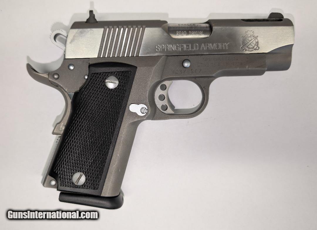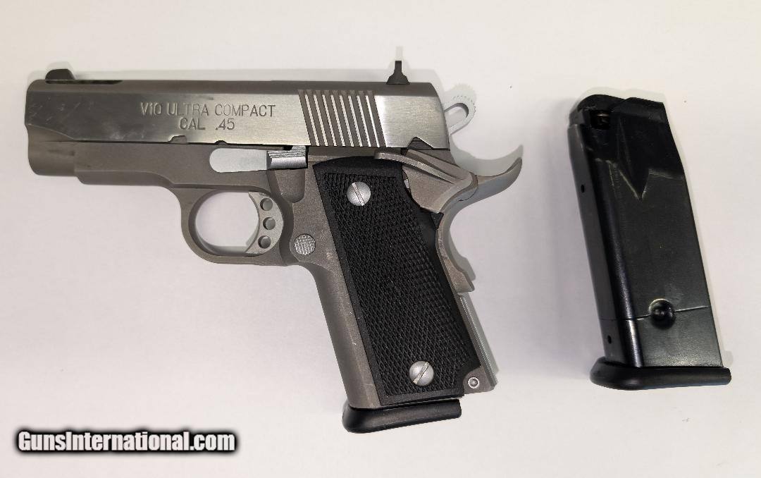 Description: Guns Listing ID: 536725 Springfield Armory V10 Ultra Compact .45 ACP Barrel Length 3 1/4 Inch Action Semi-Auto Gun Weight 36 ounces Round Capacity 10 + 1 Cartridge .45 Auto Hand Right Barrels 3.25\" Sights Fixed 3-Dot Sights GRIP Condition Slight Wear Metal Condition \"Some holster wear, wear on the high points.\" Triggers Factory Bore Condition \"Shiny, rifling is complete and consistent.\" Chambers .45 Auto FACTORY BOX & 2 MAGS INCLUDED SOLD Manufacturer: SPRINGFIELD ARMORY Model: V10 ULTRA COMPACT Caliber Info: .45 ACP Condition: Used - Non-Certified Barrels: 3.25 BARREL Action: SEMI AUTOMATIC Finish: stainless |